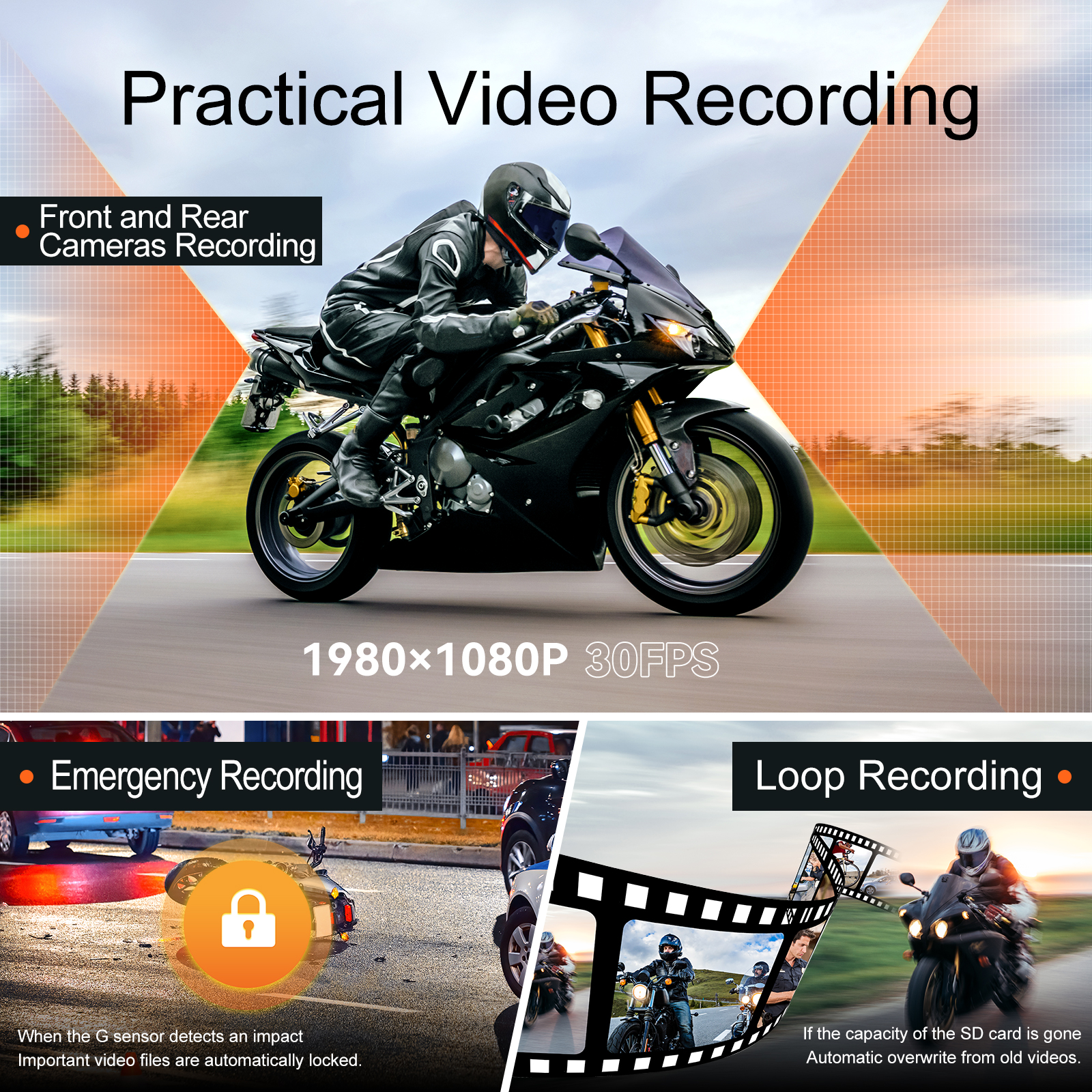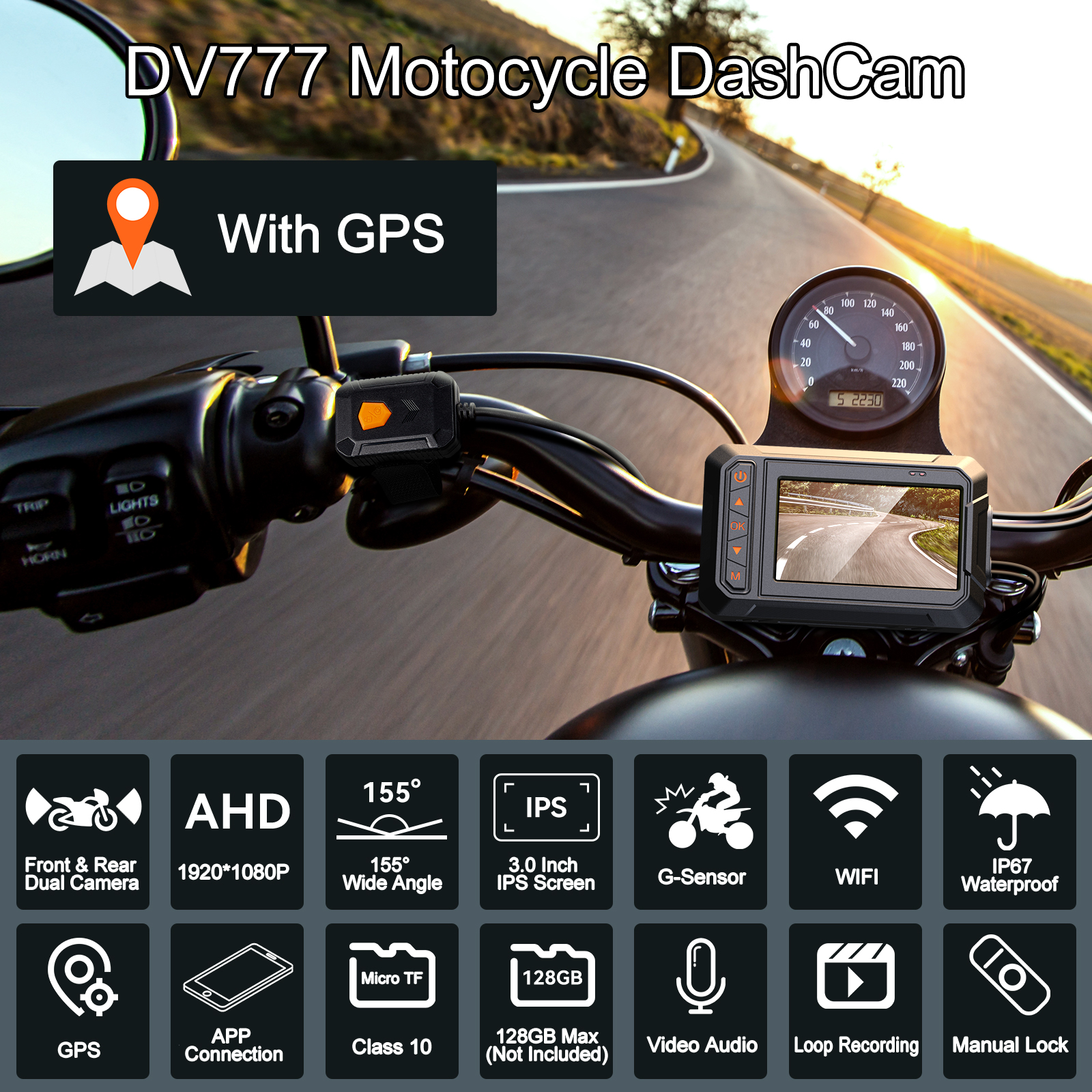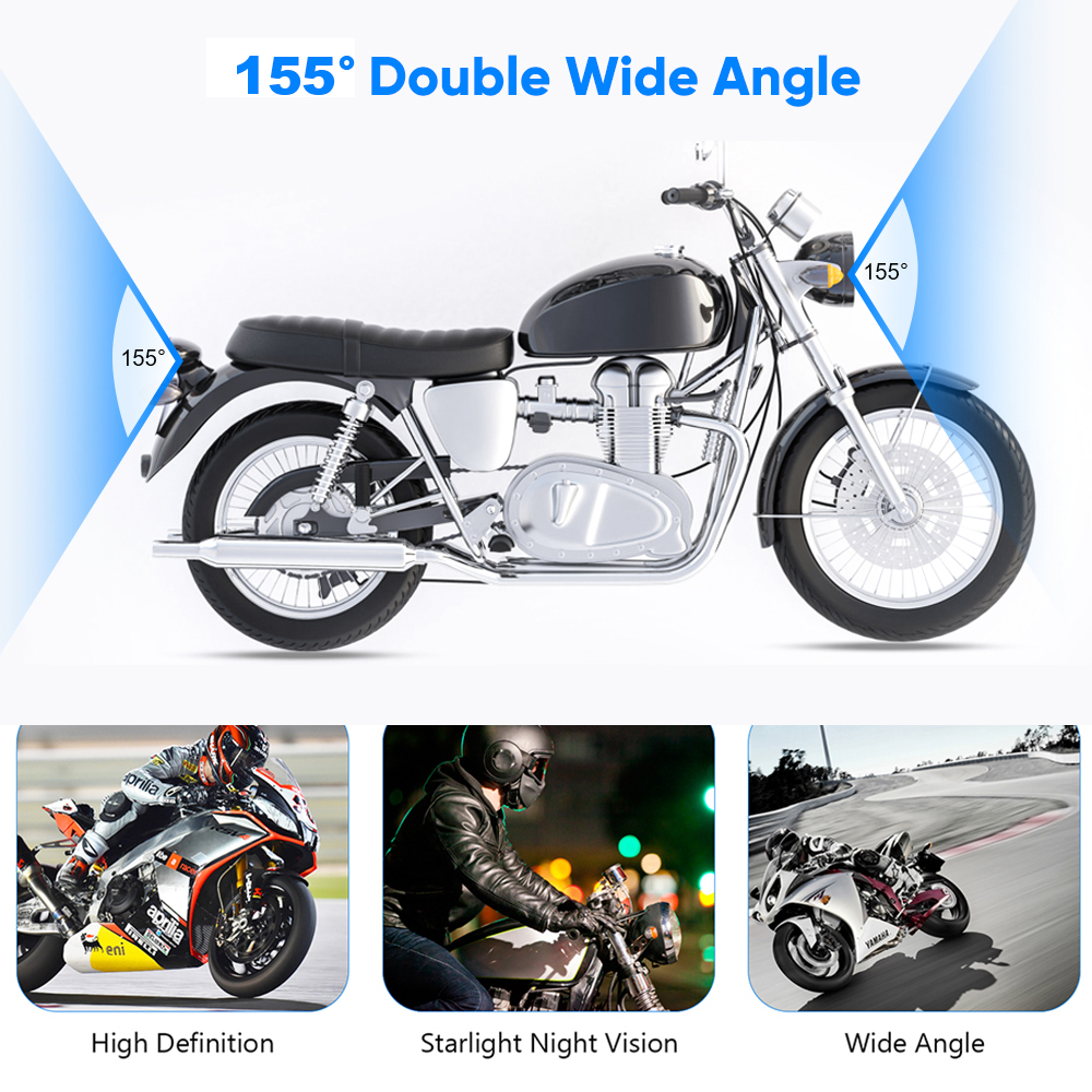 Видеорегистратор DV777 для мотоциклов оснащен двумя передними и задними объективами мощностью 155 ° 200 Вт. Передняя и задняя камеры записывают важные моменты со скоростью 1080P 30 кадров в секунду.