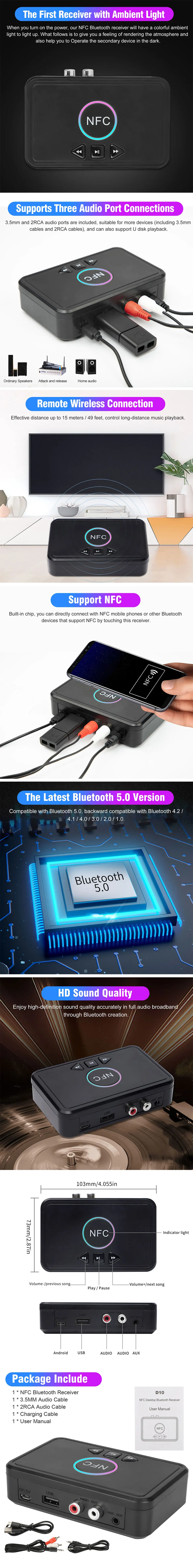Беспроводной адаптер NFC Bluetooth BT5.0 приемник передатчик аудио 3,5 мм разъем AUX 2 RCA стерео звук для динамика гарнитура автомобильный DVD и т. Д.
