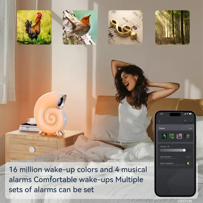 16 миллионов цветов пробуждения и 4 музыкальных будильника. Можно установить несколько наборов будильников.