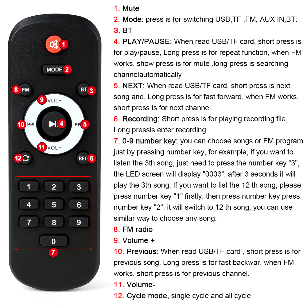 Функция: MP3-плеер, fm-радио, tf-карта, линейный вход, воспроизведение музыки через USB, дистанционное управление