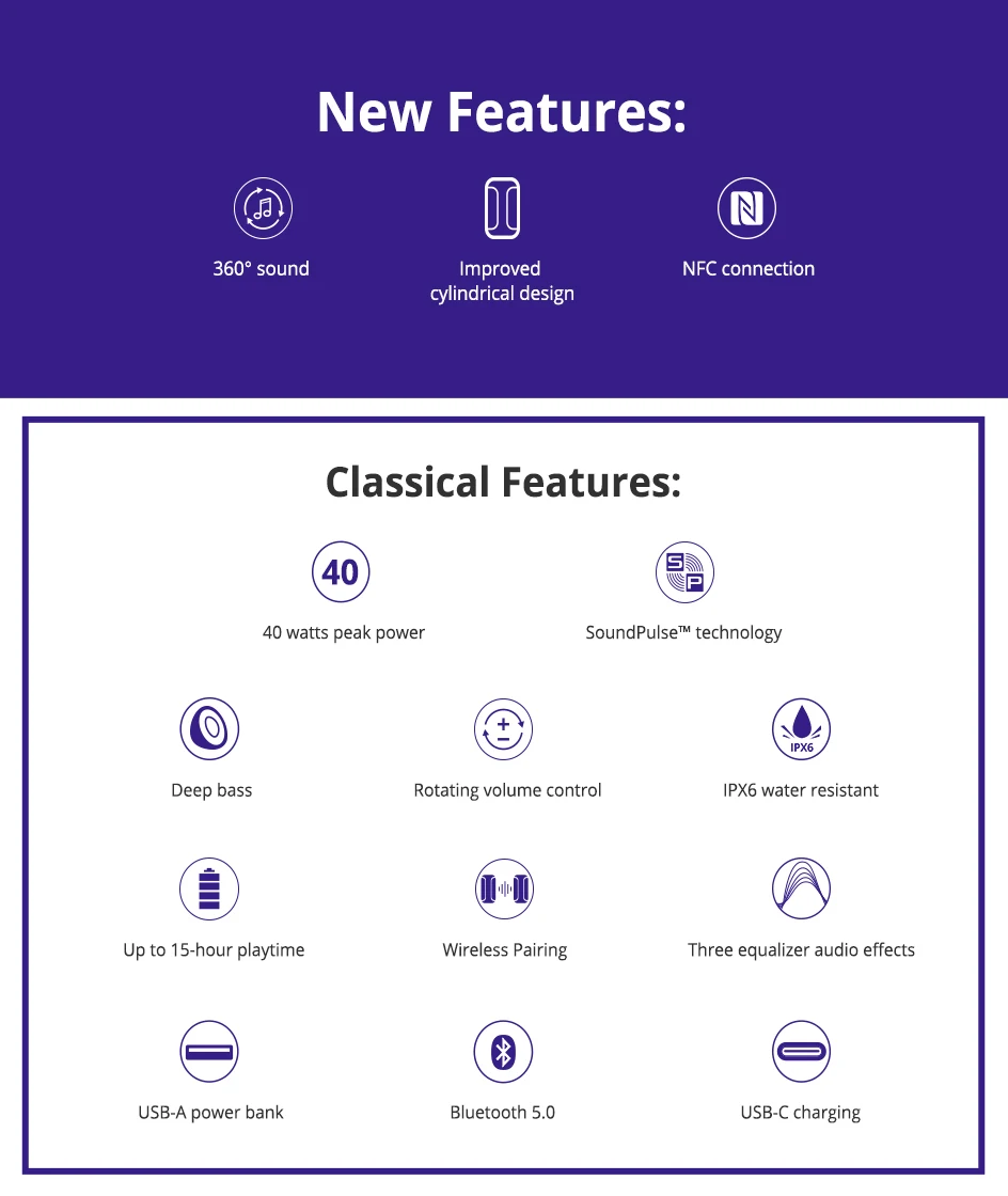 Эксклюзивный SoundPulse™Технология обеспечивает пиковую мощность 40 Вт, делая басы глубже, а вокал более четким.