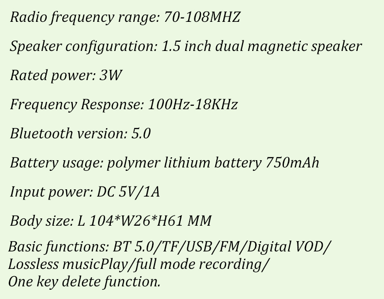 Основные функции: BT 5,0/TF/USB/FM/цифровой VOD/музыка без потерь