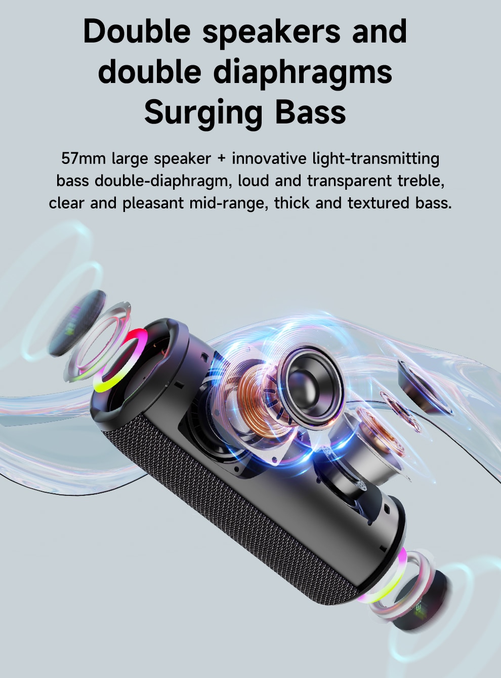 Full Bass Stereo-динамики Bluetooth обеспечивают захватывающий звук, Насыщенные басы, средние частоты и динамический звук. Даже на максимальной громкости не будет сломанного звука, как на живом концерте.