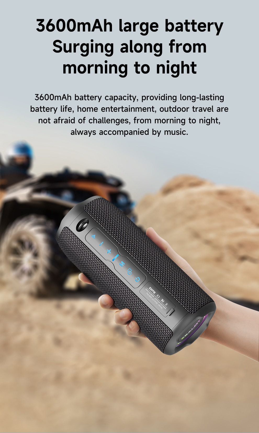 • IPX6 Водонепроницаемый :Этот динамик водонепроницаем, что делает его идеальным для активного отдыха или случайных разливов.