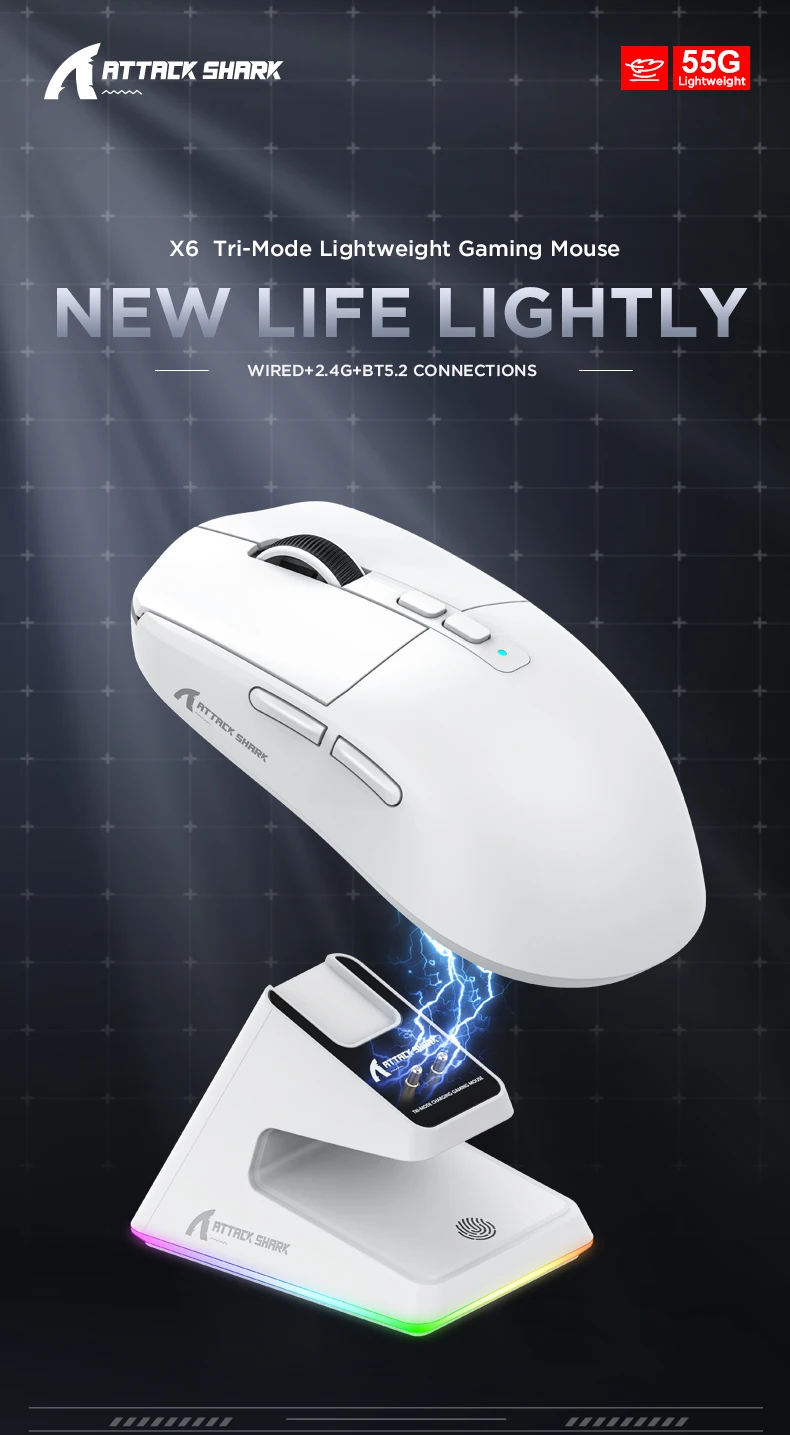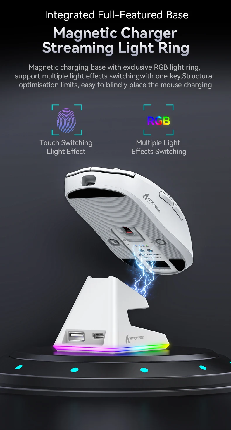 Bluetooth-мышь Attack Shark X6 PAW3395, трехрежимное соединение, RGB сенсорная Магнитная Зарядная база, макро игровая мышь