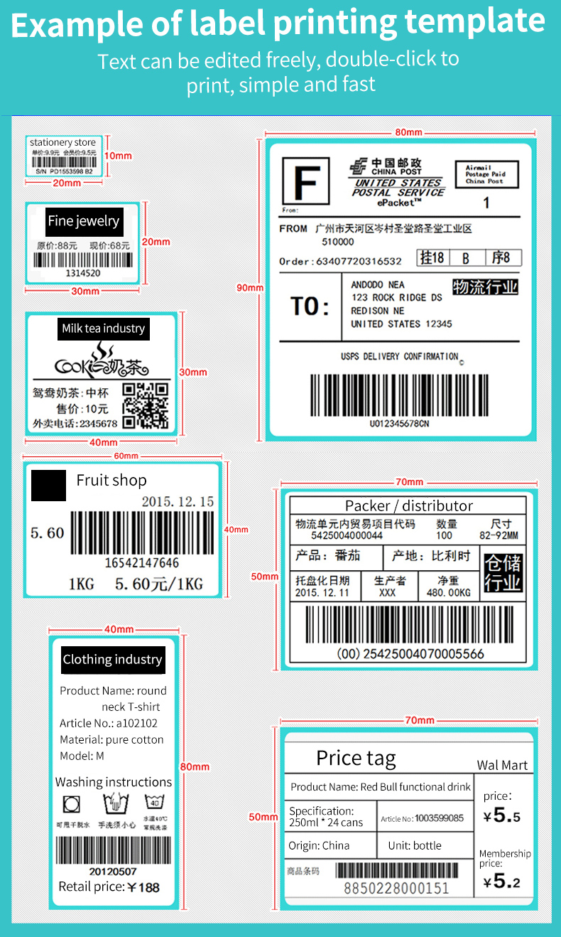 It supports printer size 20-108mm size width paper,include small label paper and shipping label 4*4/4*6 inch