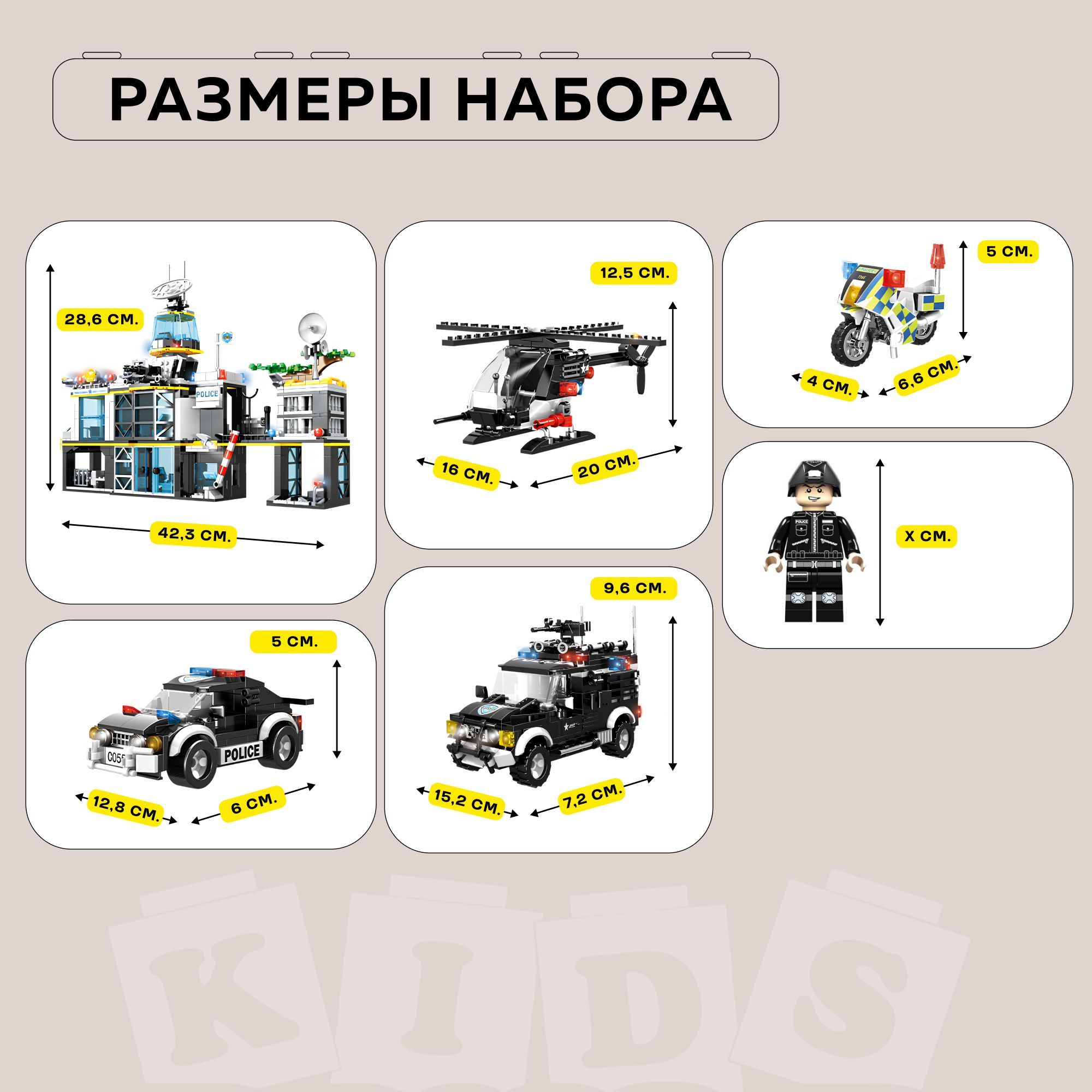 Описание: Состав конструктораВ комплекте вы подробную инструкцию сборки, которая поможет построить настоящий полицейский участок, в котором каждый юный полицейский сможет раскрыть свой потенциал. Игровой набор позволяет собрать 4 отдельных модели транспорта - полицейская машинка, внедорожник, вертолет, полицейский мотоцикл и само здание полицейского участка, они сопровождаются группой спецназа, это 6 полицейских человечка с комплектом оружия и боеприпасов автоматы, пистолеты, ножи, гранаты и щиты.Детали подвижныеОткрываются двери, люкиРазные комнаты в участкеВертолетВнедорожникПолицейский автомобильБольшой конструкторДетали конструктора совместимы с известными брендами. Для производства применяется безопасный пластик. Товар имеет сертификат качества и безопасен для вашего ребенка. Подробнееможно купитьКонструктор полицейский патрульПодробнееМожно купитьКонструктор автобус спецназПодробнееможно купитьКонструктор робот и бронемобиль