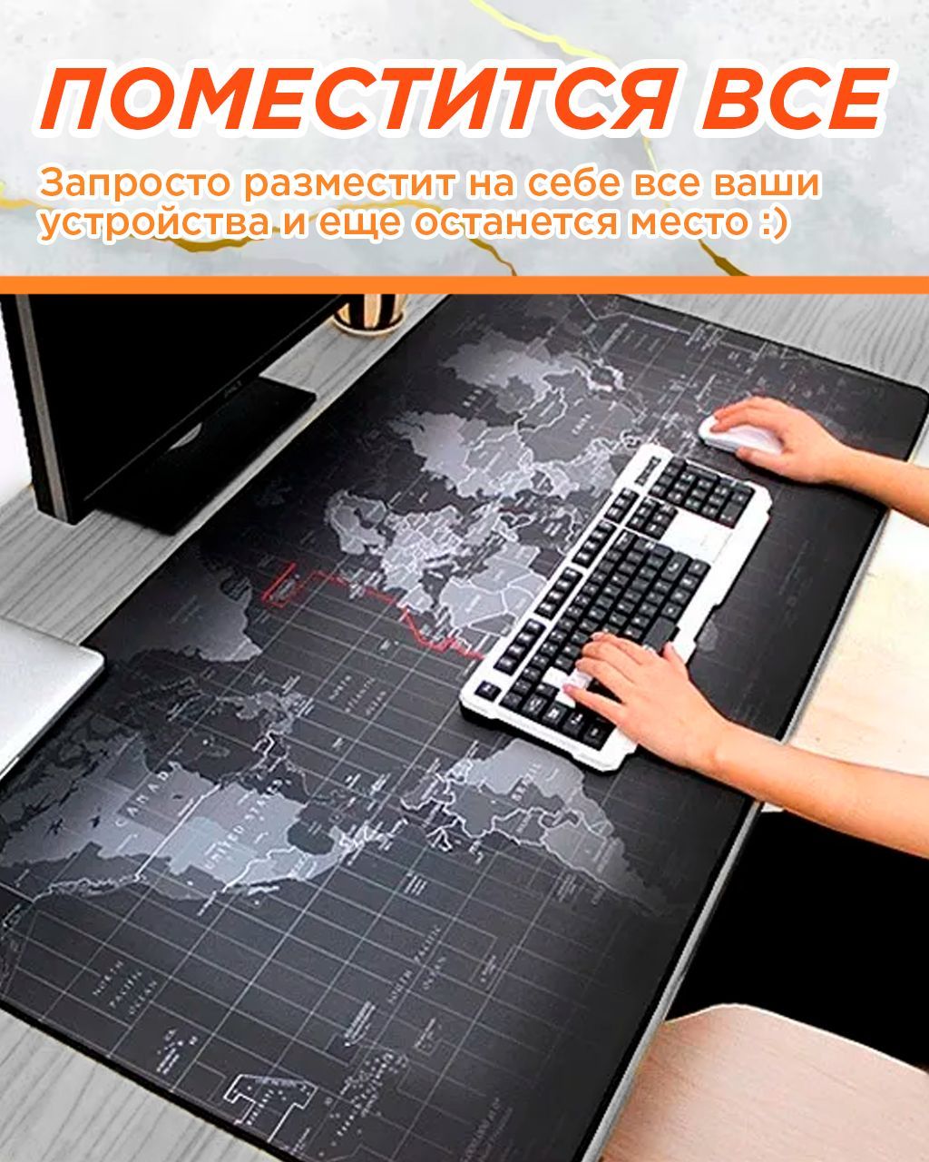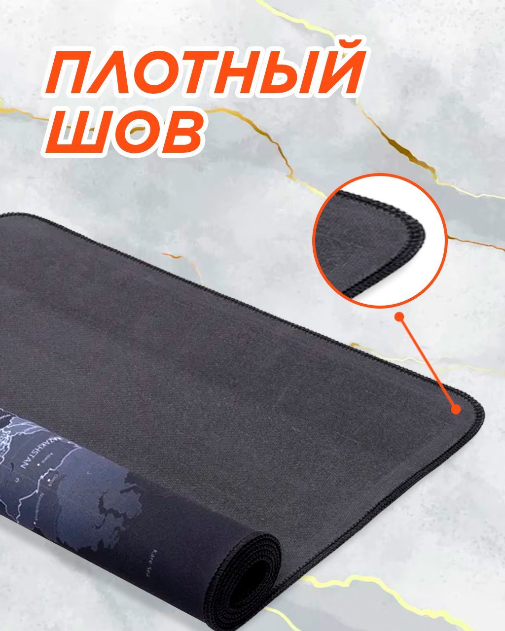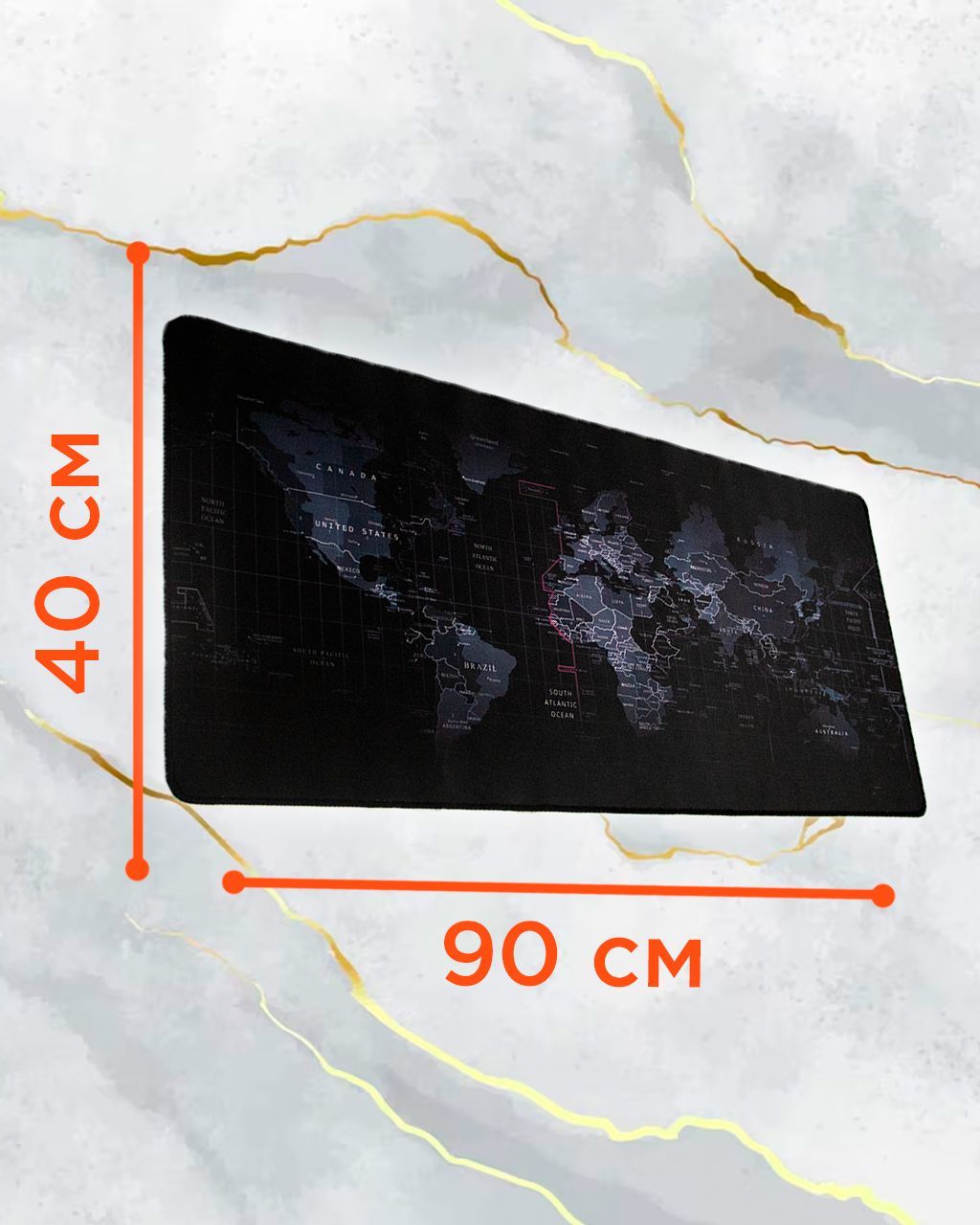 Большой широкий коврик на стол для клавиатуры, мыши, ноутбука "Карта Мира" 90х40 см/ игровой прорезиненный ковёр/ Детский игровой компьютерный антискользящий противоскользящий резиновый/ Для компьютерного офисного стола с принтом настольный черный фон
