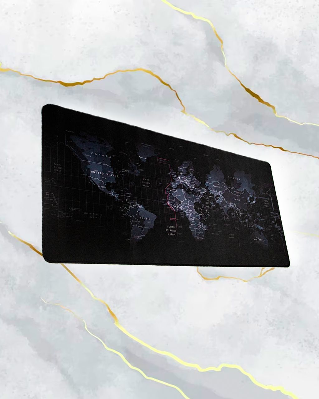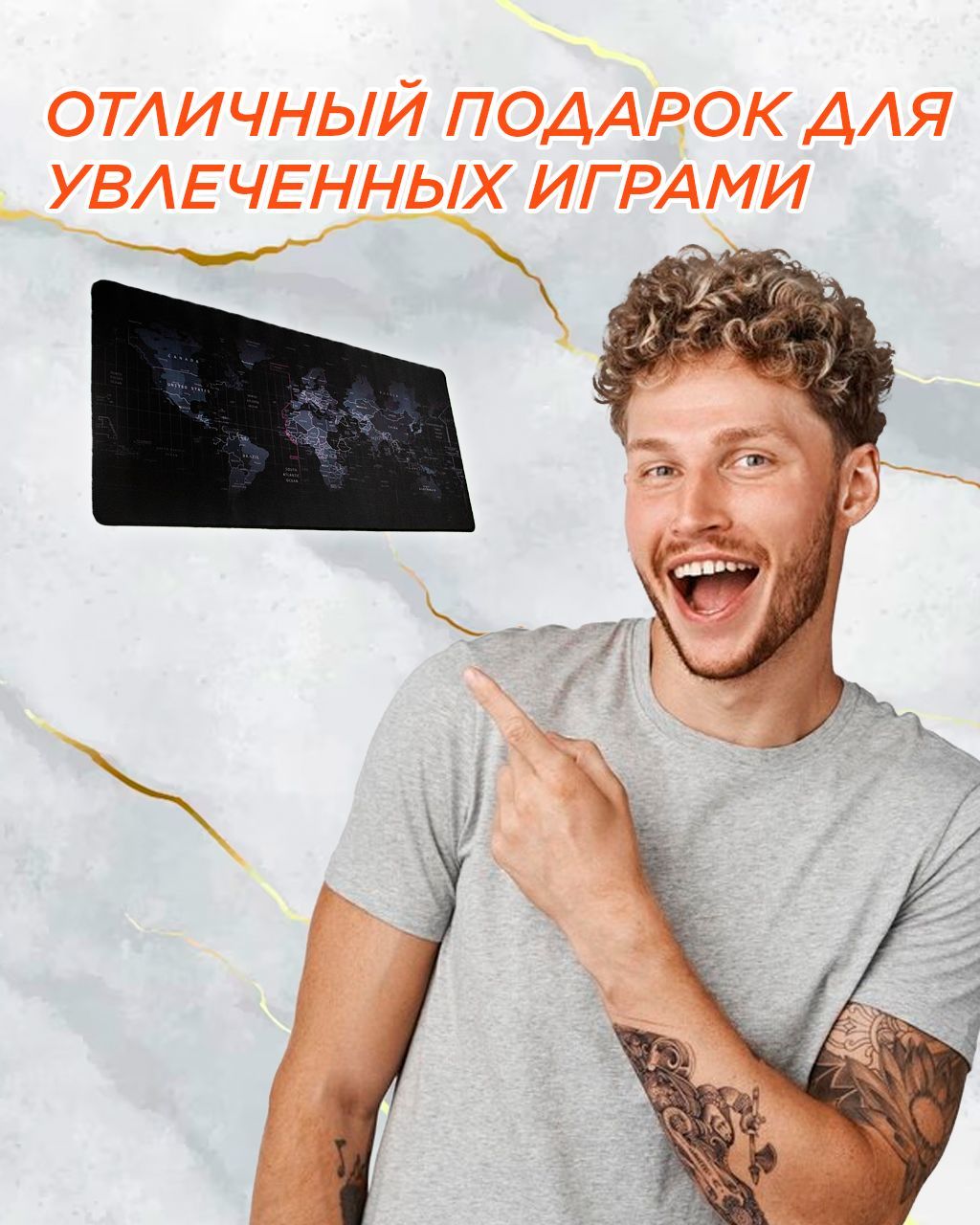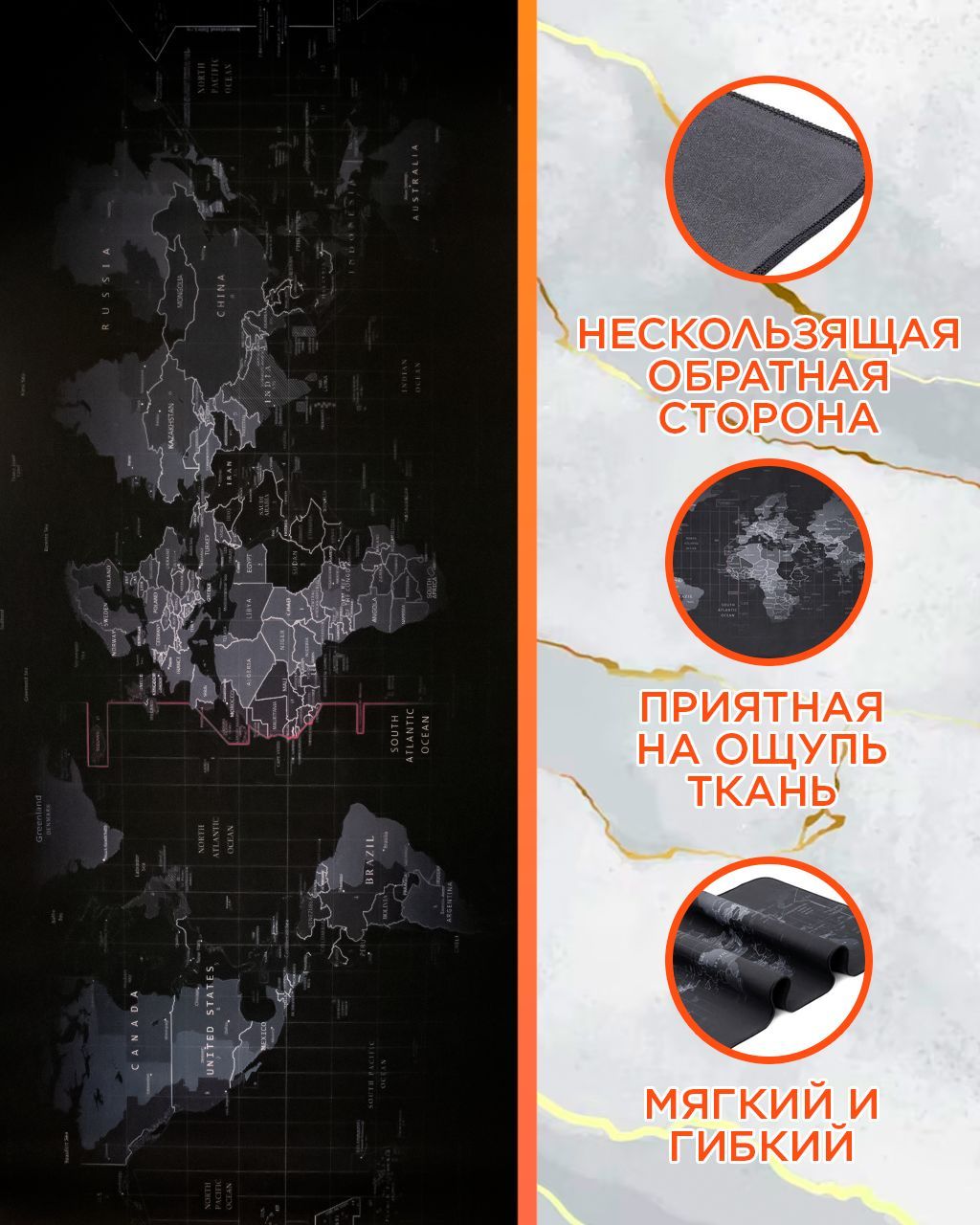 Большой широкий коврик на стол для клавиатуры, мыши, ноутбука "Карта Мира" 90х40 см/ игровой прорезиненный ковёр/ Детский игровой компьютерный антискользящий противоскользящий резиновый/ Для компьютерного офисного стола с принтом настольный черный фон