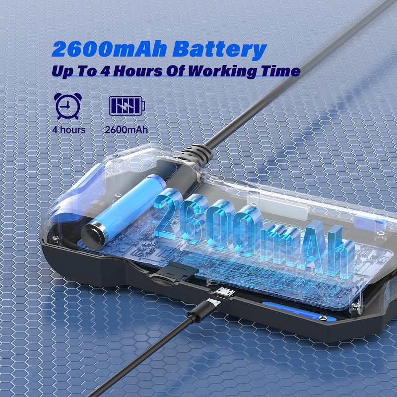-Встроенный аккумулятор 2600 мАч на 3-5 часов рабочего времени.