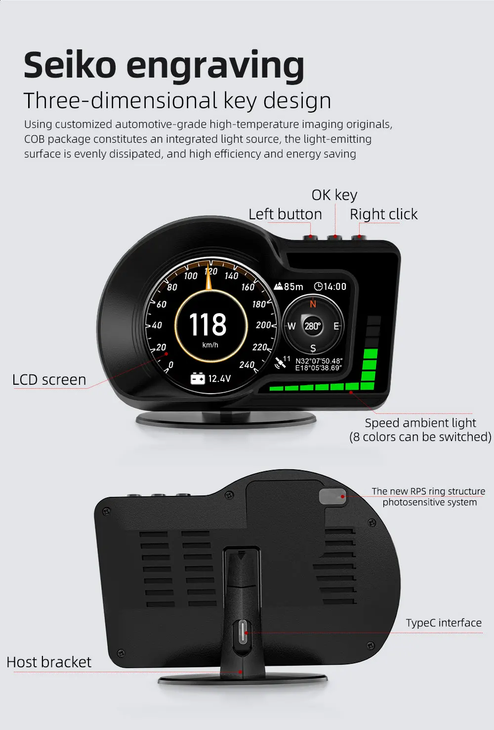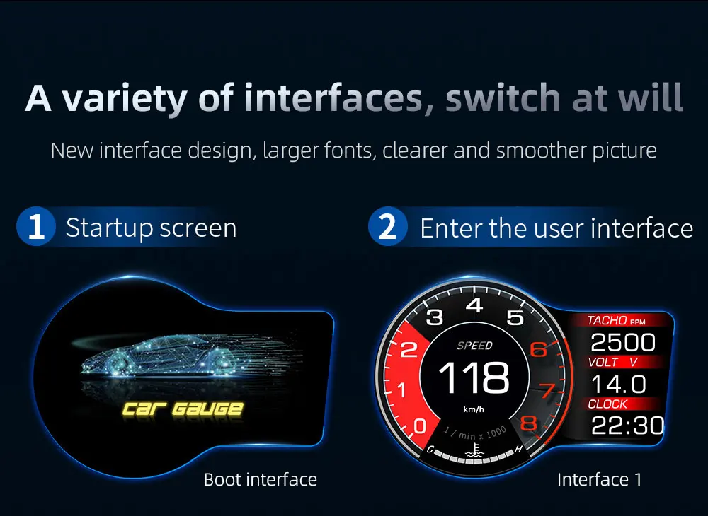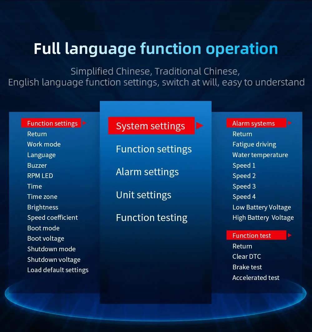 Сигнализация скорости, сигнализация температуры воды, Сигнализация низкого напряжения, сигнализация высокого напряжения, сигнализация усталости вождения, сигнализация DTC автомобиля и другие сигналы тревоги.