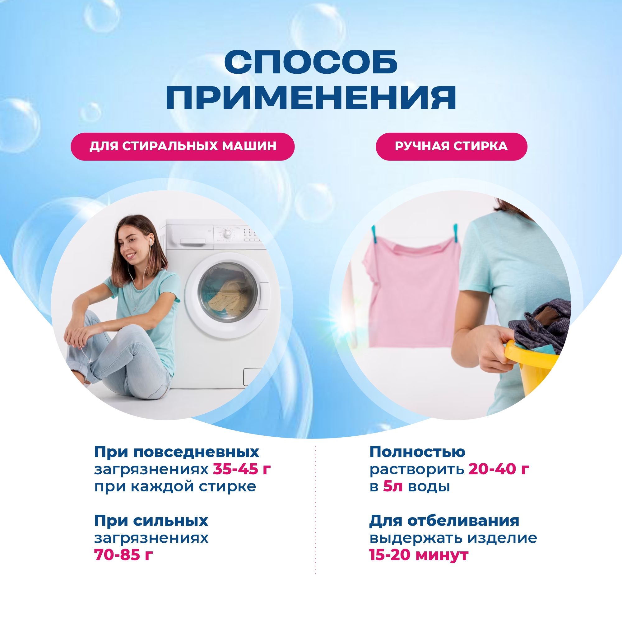 Можно использовать для ручной стирки и для стиральной машинки, или для удаления пятен без стирки. Подходит для стирки любых тканей и одежды, включая детскую одежду. Не содержит агрессивных химических веществ, которые могут повредить белье или вызвать аллергическую реакцию. Бережно отбеливает белое нижнее белье, шелк и шерсть. Ткань сохраняет прочность волокон при стирке, вещи не формируются, не садятся, не теряют первоначальный вид. С помощью порошка можно удалить пятна с любых поверхностей, включая текстиль, ковры, кожу, мебель и даже поверхности из металла и стекла. Можно использовать не только как средство для стирки белого белья. При регулярном использовании отбеливатель для одежды заменит химчистку. Безупречно отбеливает тусклые и пожелтевшие от старины вещи.
