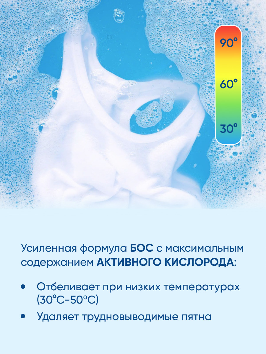 Усиленная формула БОС ПЛЮС Maximum oxygen с большим составом активного кислорода полностью безопасный и эффективный и не только отбеливает ткани, но и дезинфицирует их. Действует как пятновыводитель, перкарбонат натрия удаляет самые сложные пятна. Бос перкарбонат натрия 100% справится со следами от вина, кофе, крови, жирных соусов, въевшейся грязи, шторы цветные, травы, ягод.Кроме того, кислородный подходит для любого типа белья - от белого до цветного.
