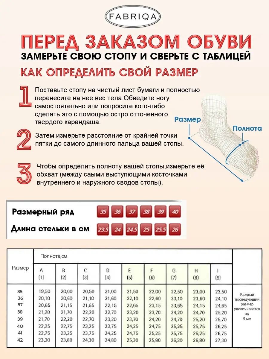 Описание: При выборе размера ориентируйтесь на таблицу на фото в карточке товара. Стильные и модные босоножки на каблуке выполнены из натуральной кожи, ручная работа, идеальное качество, подкладка - натуральная кожа, удобная колодка, оригинальный дизайн, смелое решение застежки, устойчивый каблук и как всегда только натуральные материалы сделали эту модель любимой многими девушками с разными предпочтениями в одежде. Босоножки женские летние натуральная кожа - это отличный вариант базовой, повседневной модели на каждый день, в школу, в офис, институт, на работу, на вечеринку. Босоножки женские натуральная кожа красиво смотрятся с джинсами, брюками, платьем и юбкой. Колодки классических босоножек разработаны совместно со специалистами анатомии тела и имеют анатомически правильную форму. Качественный пошив, натуральные материалы подарят комфорт в каждом шаге, будьте в центре внимания! Компания FABRIQA изготавливает высококачественную женскую обувь для Вас. Желаем Вам приятных покупок.