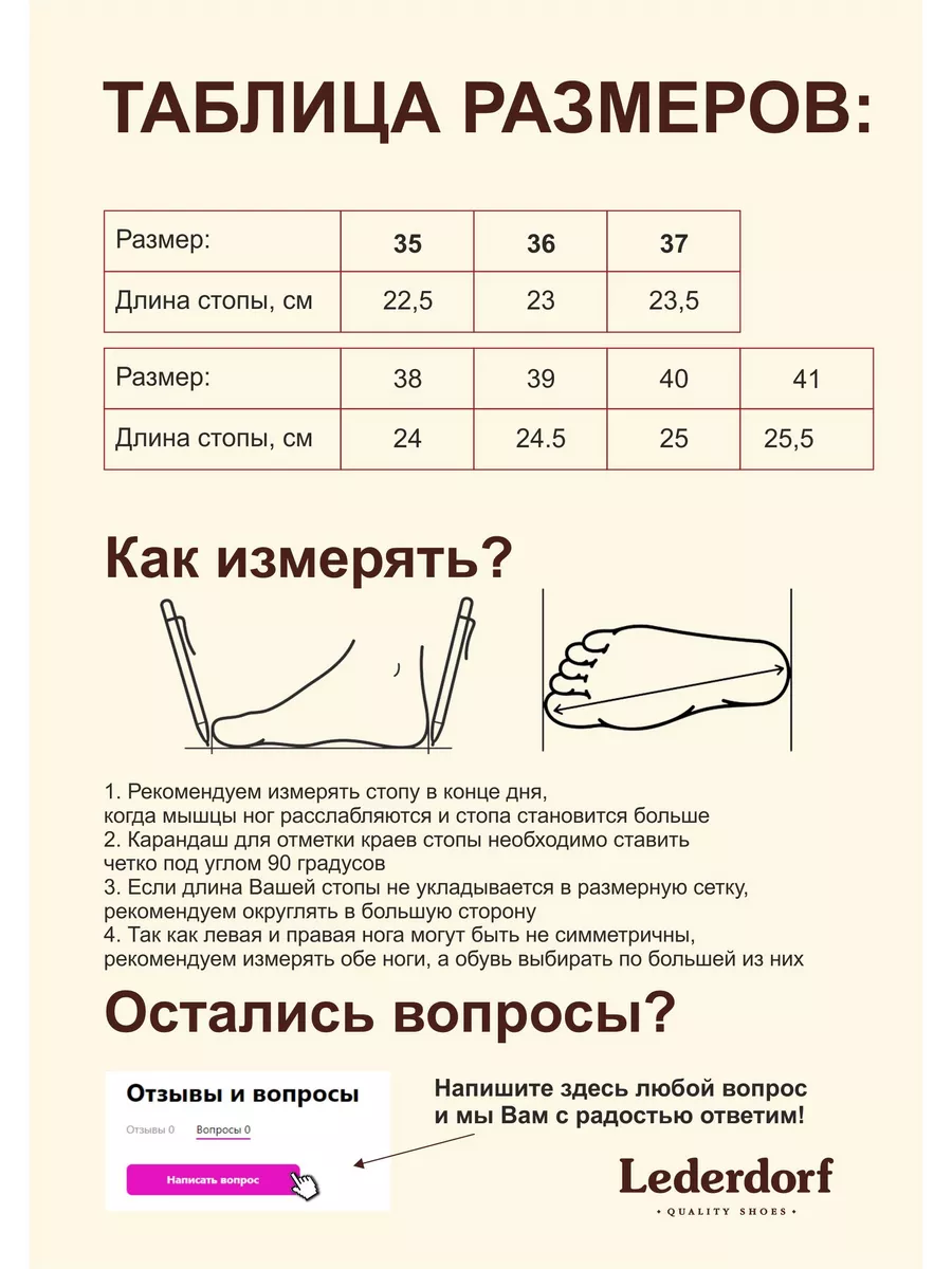Описание: Ботинки «LEDERDORF» изготовлены из высококачественной экокожи, подкладка - натуральная шерсть, нескользящая подошва, анатомические стельки. Материалы гарантируют долговечность, обеспечивают надёжность, защиту и комфорт в любых погодных условиях. Экокожа обеспечивает долговечность и повышенную стойкость к износу, она водостойкая и прочная, сохраняет свою форму долгое время. Подкладка - мягкая и теплая натуральная шерсть, она обеспечит дополнительный комфорт и защиту от холода. Стельки в наших ботинках подстраиваются под форму вашей стопы и обеспечивают оптимальную поддержку ноги и комфорт при ходьбе. Подошва наших ботинок изготовлена из термоэластопласта, он прочный и эластичный, хорошо справляется с высокими нагрузками. Материал позволяет обуви прослужить не один год, а также хорошо переносит низкие температуры. Она предназначена для обеспечения хорошего сцепления с различными поверхностями и предотвращения скольжения. Классический черный цвет делает эти ботинки универсальными и легко сочетающимися с любым нарядом. Они станут отличным дополнением к вашей гардеробной коллекции. С нашими зимними ботинками и челси вы будете выглядеть и чувствовать себя уверенно и комфортно в любой ситуации. Приобретайте качественную и стильную обувь «LEDERDORF».