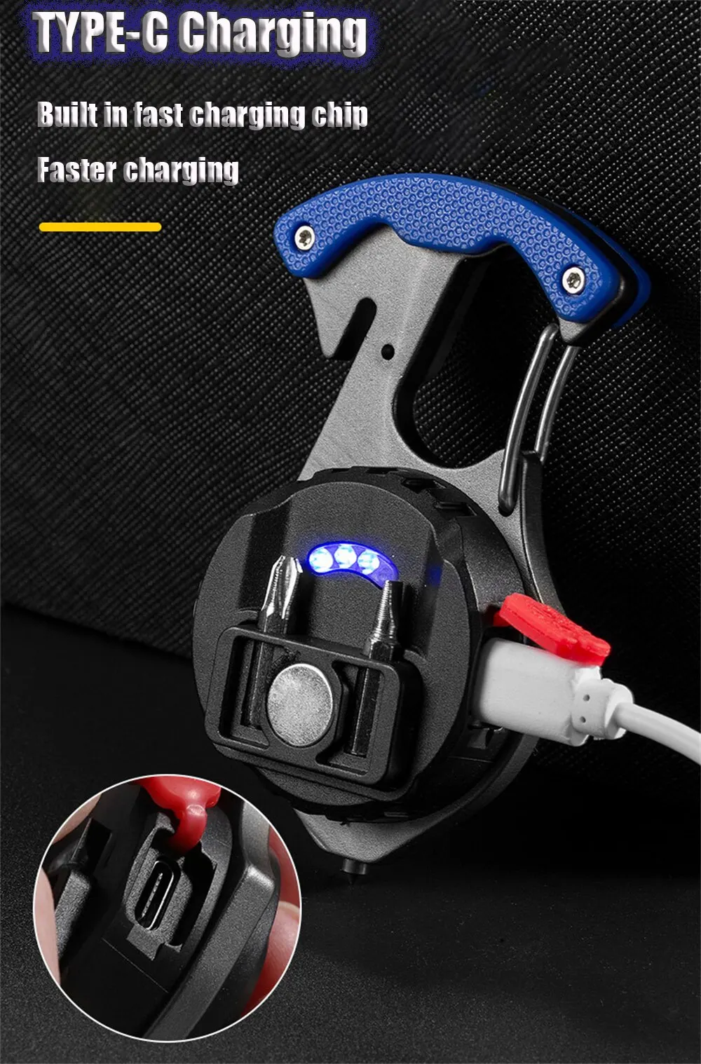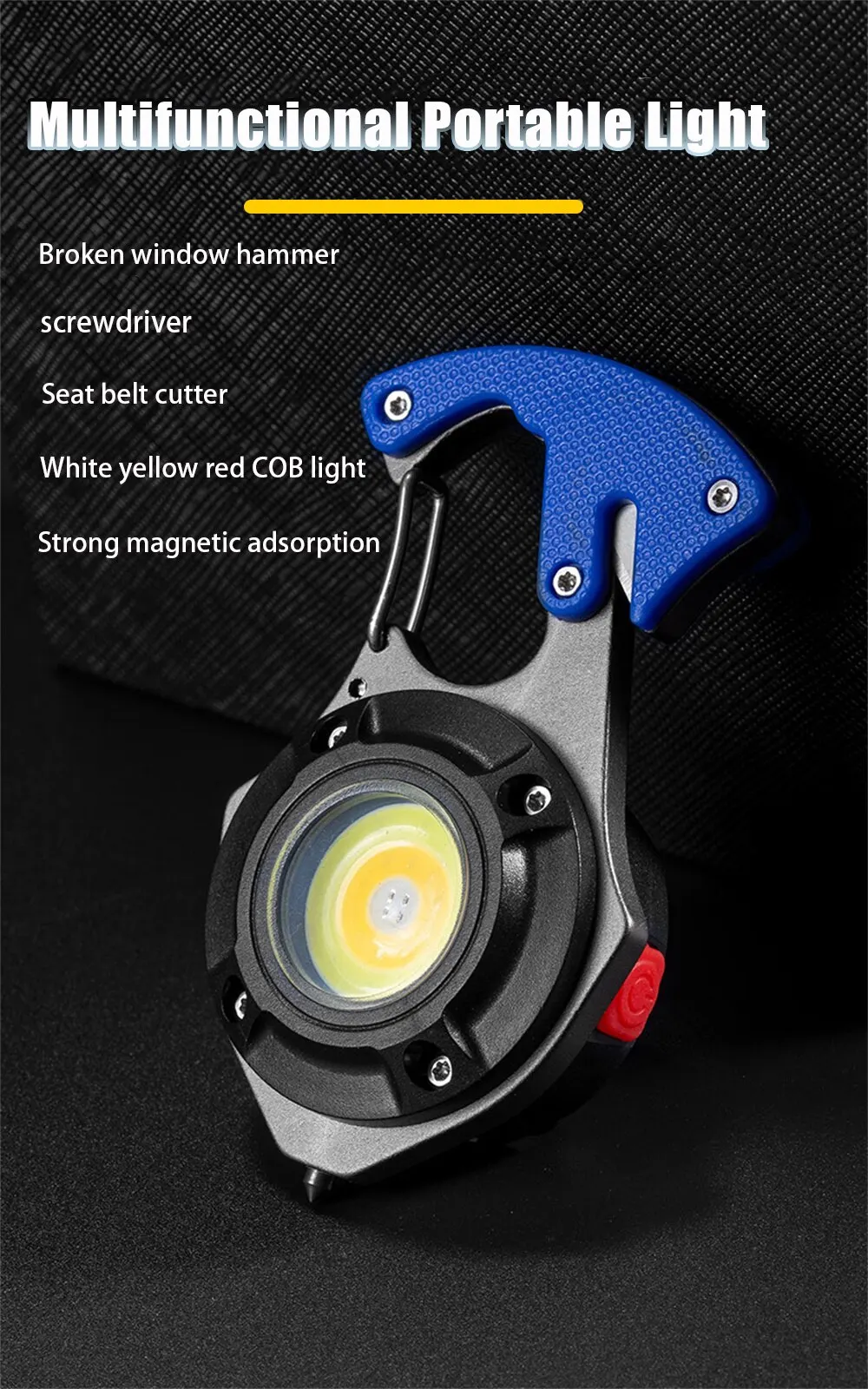 2. Многофункциональный дизайн, сильная Магнитная Адсорбция на спине, может свободно адсорбироваться на железных металлических поверхностях. Задняя отвертка. Аварийный молоток для разбивания окон внизу. Он также поставляется с резаком для ремня безопасности.