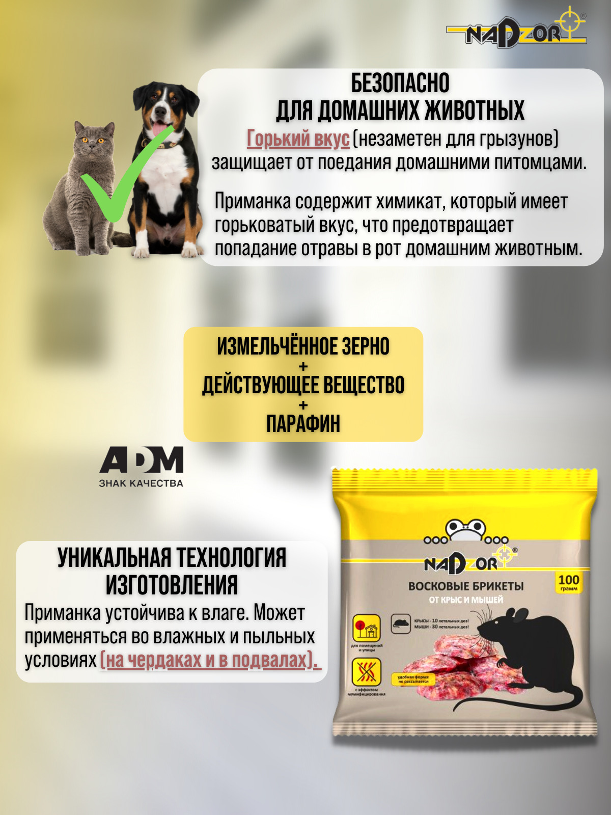 • Горечь, введенная в состав приманки Надзор, не распознается грызунами, но препятствует случайному поеданию ее домашними животными.