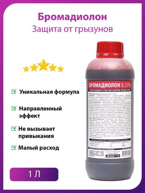 Описание: Бромадиолон 1 л. - средство в форме концентрата для самостоятельного приготовления приманок от крыс и мышей. Простое и очень эффективное и экономичное решение. Используется для самостоятельного приготовления приманок. Способ применения: приманку готовят, тщательно смешивая концентрат с доброкачественной пищевой основной (зерно, крупа, гранулированный комбикорм и др.). Относится к препаратам хронического действия 2-го поколения и предназначен для приготовления приманок для уничтожения грызунов (мышей, крыс, полевок, кротов и т.д.)