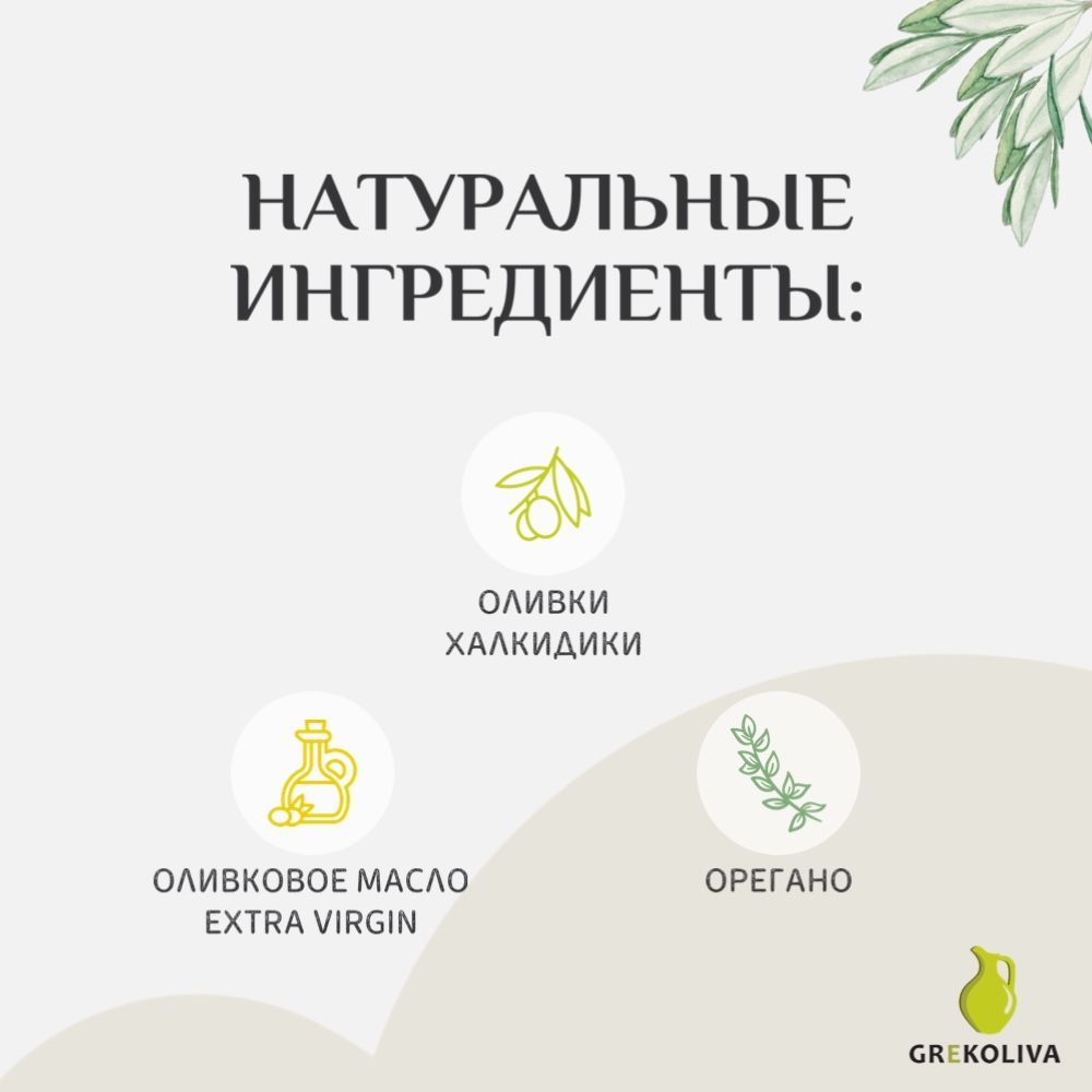 Оливки зеленые Халкидики (70%), оливковое масло (30%), чеснок, орегано, соль.