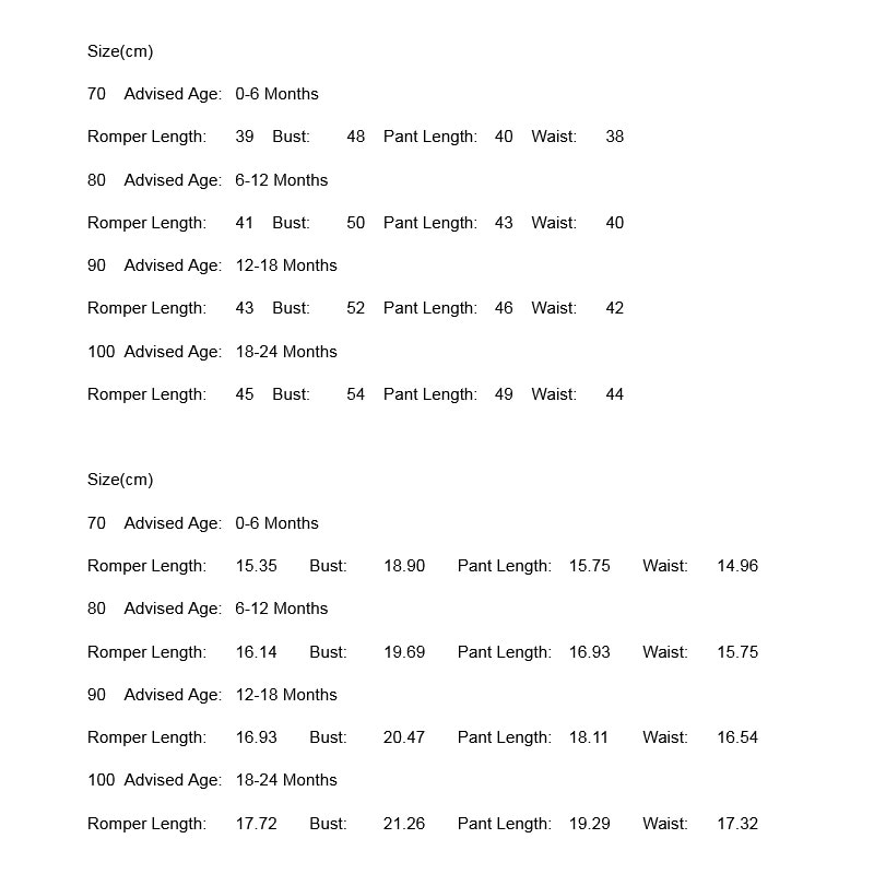 80 Рекомендуемый Возраст: 6-12 месяцев Длина комбинезона: 16,14 Бюст: 19,69 Длина брюк: 16,93 Талия: 15,75