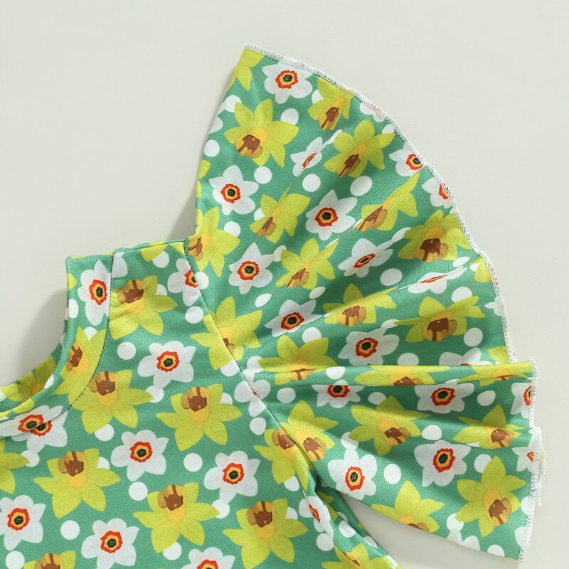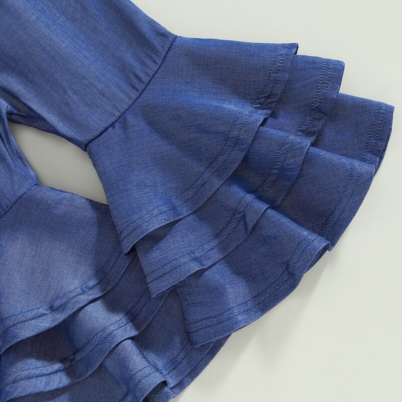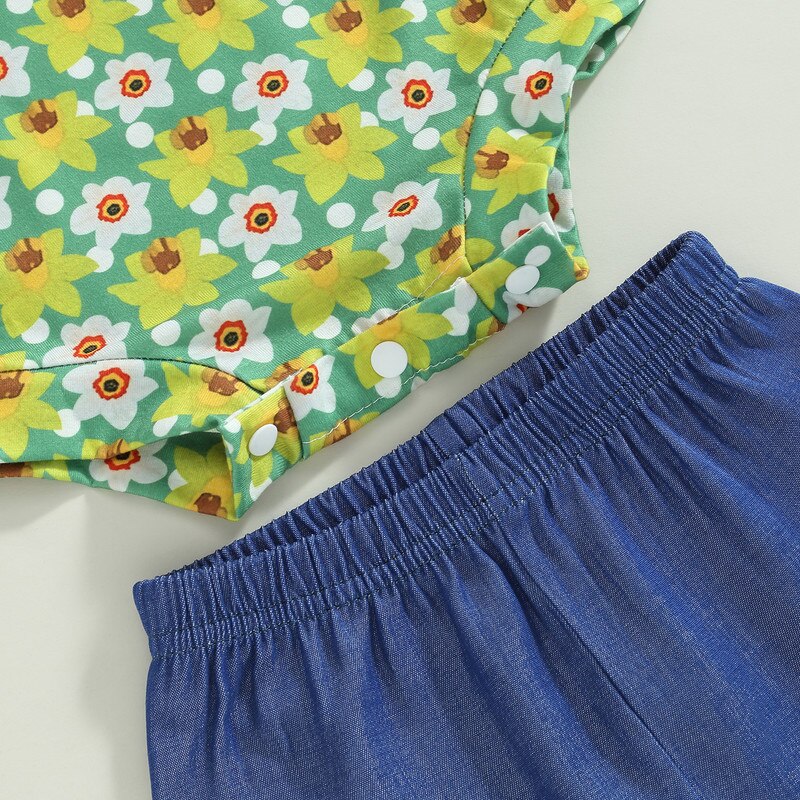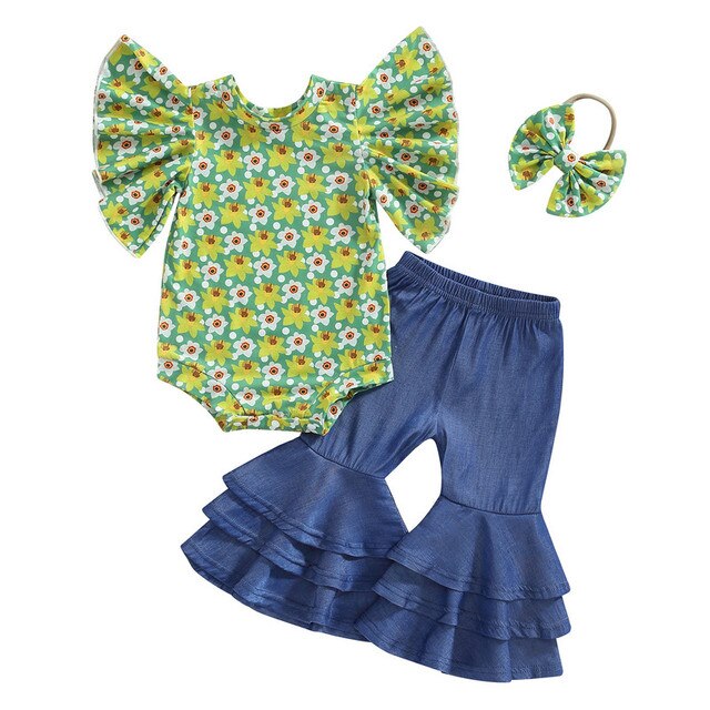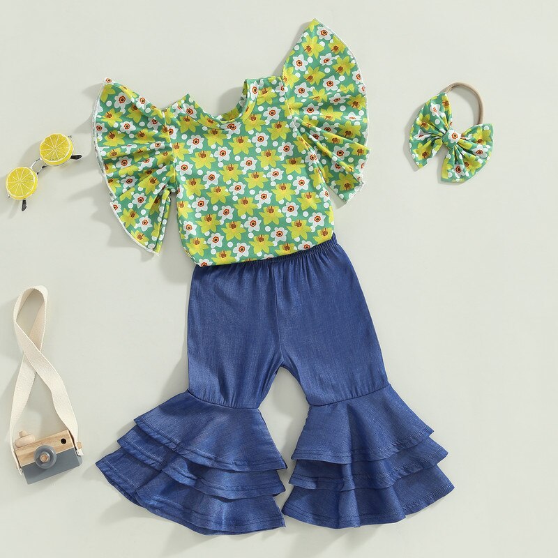 Брючный комплект для новорожденных девочек, летняя одежда 2023, наряды, цветочный боди, топы и джинсовые расклешенные брюки, повязка на голову, одежда для девочек