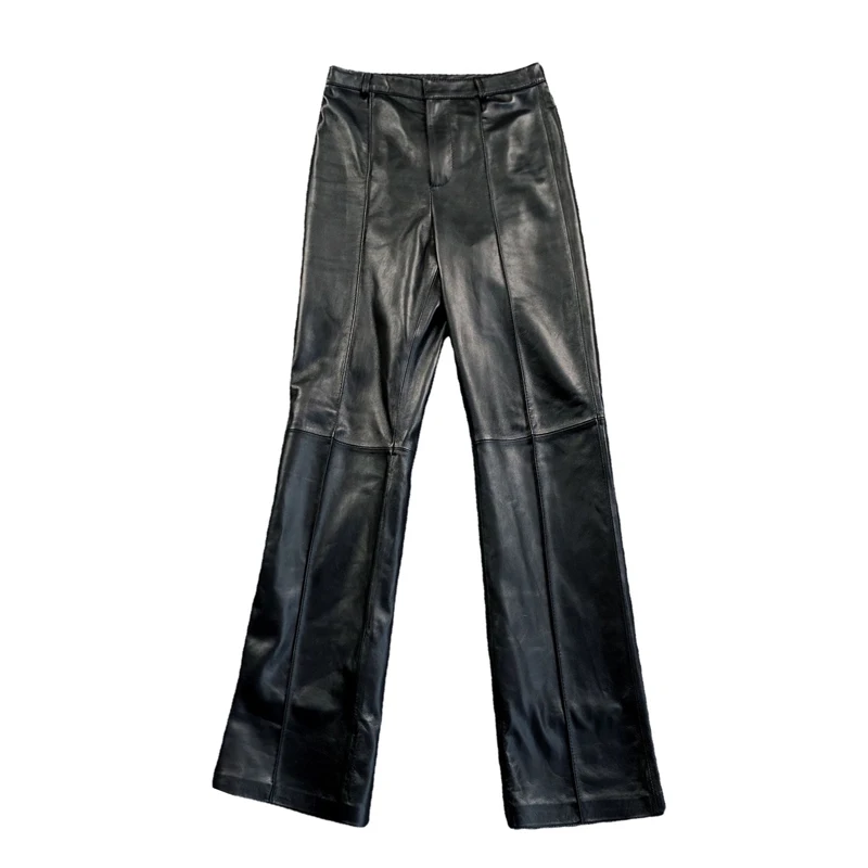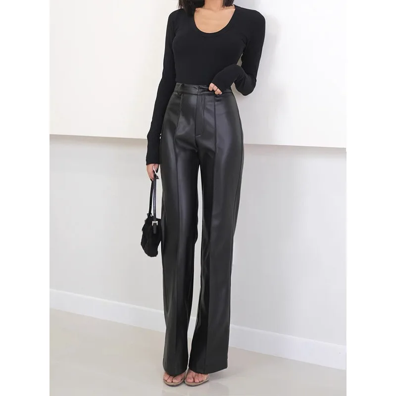 Брюки для женщин из натуральной кожи, классические прямые брюки-трубопровод, высокие повседневные уличные штаны с длинными штанинами