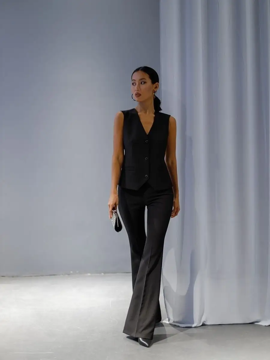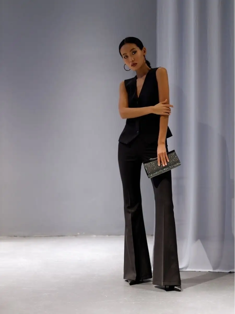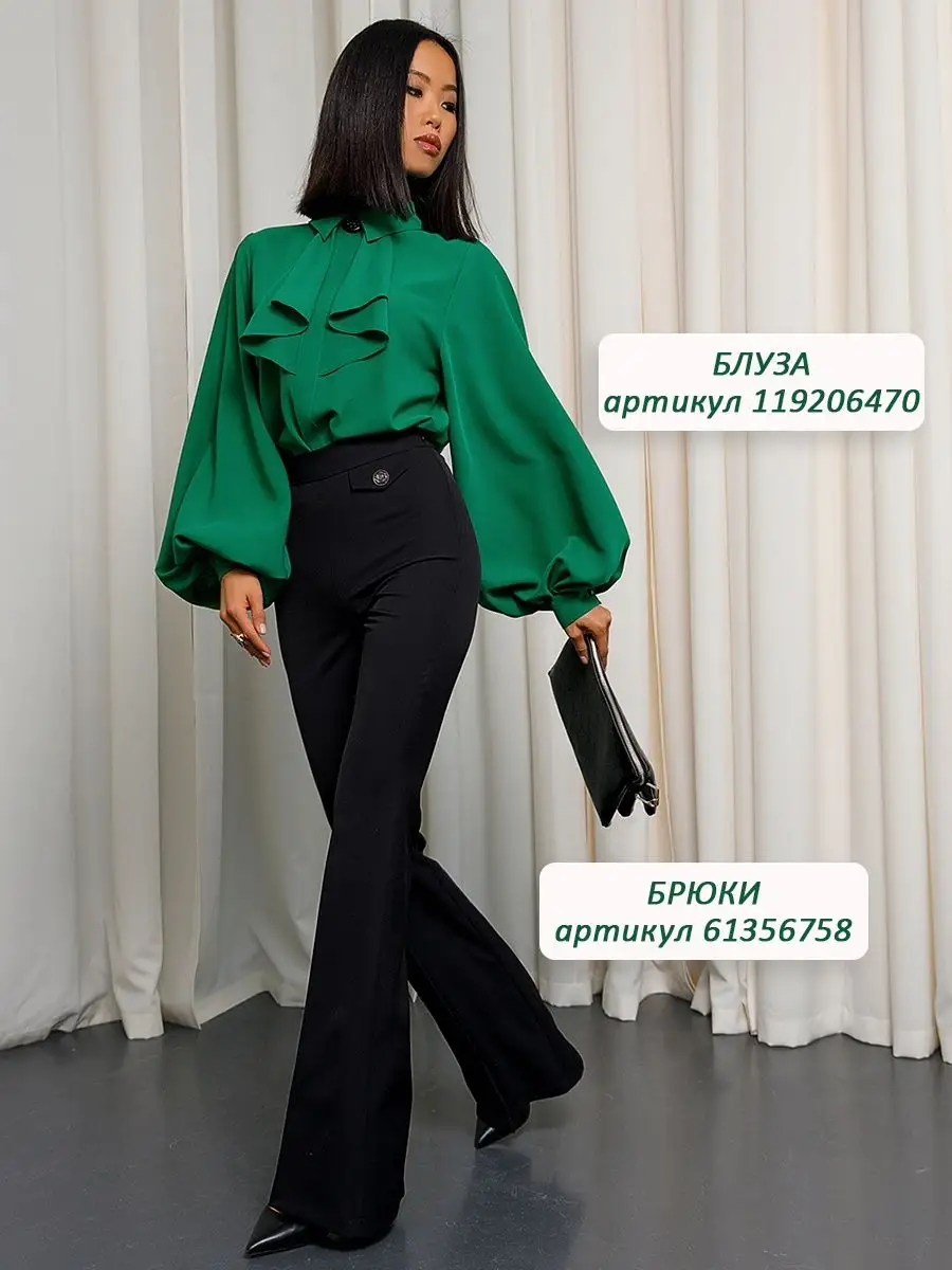 Описание: Стильные брюки-клеш с высокой посадкой и элегантной винтажной фурнитурой. Носите классические женские брюки с жакетами, блузками, свитером или водолазкой. Модные деловые брюки с высокой посадкой визуально вытягивает силуэт, делая ноги зрительно стройнее и длиннее, при этом надежно скрывая любые несовершенства. В конце рабочего дня офисные брюки могут стать частью вечернего образа. (корпоратив, День Рождения, 14 февраля, 8 марта) Стильные брюки застегиваются на потайную молнию сбоку. Брюки клёш с завышенной талией / классические / с высокой посадкой / клеш от колена