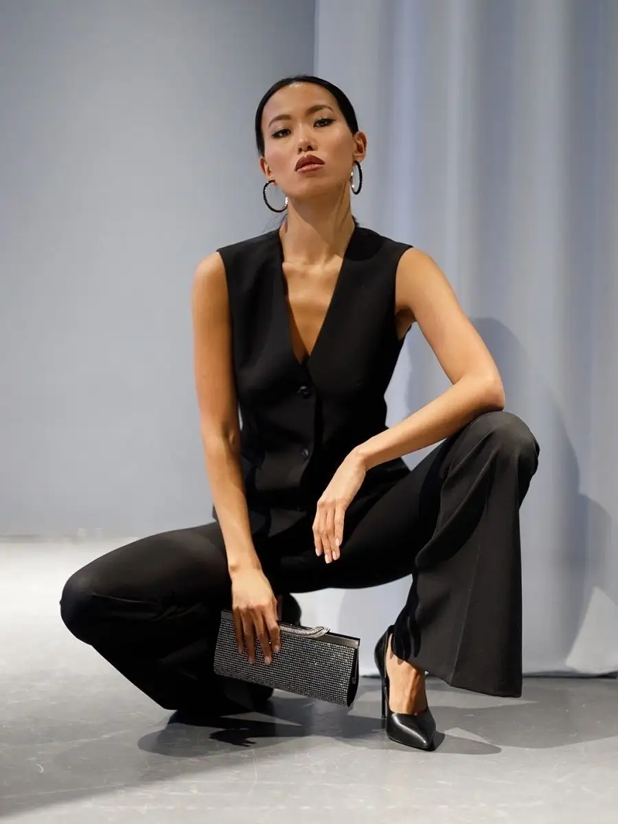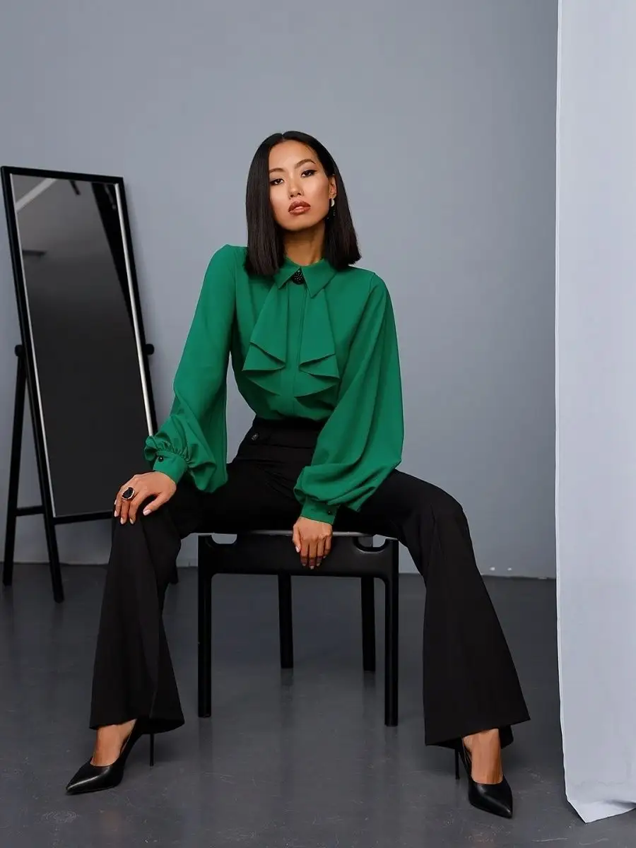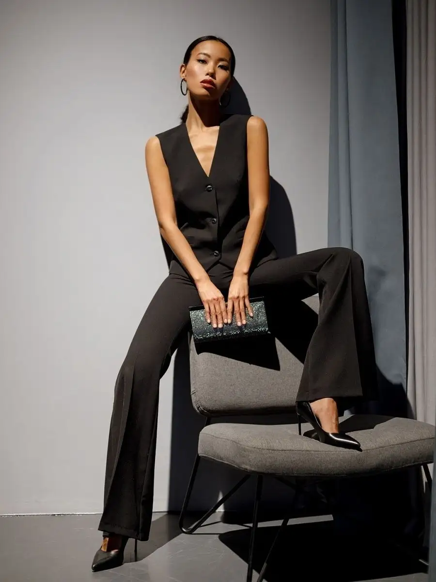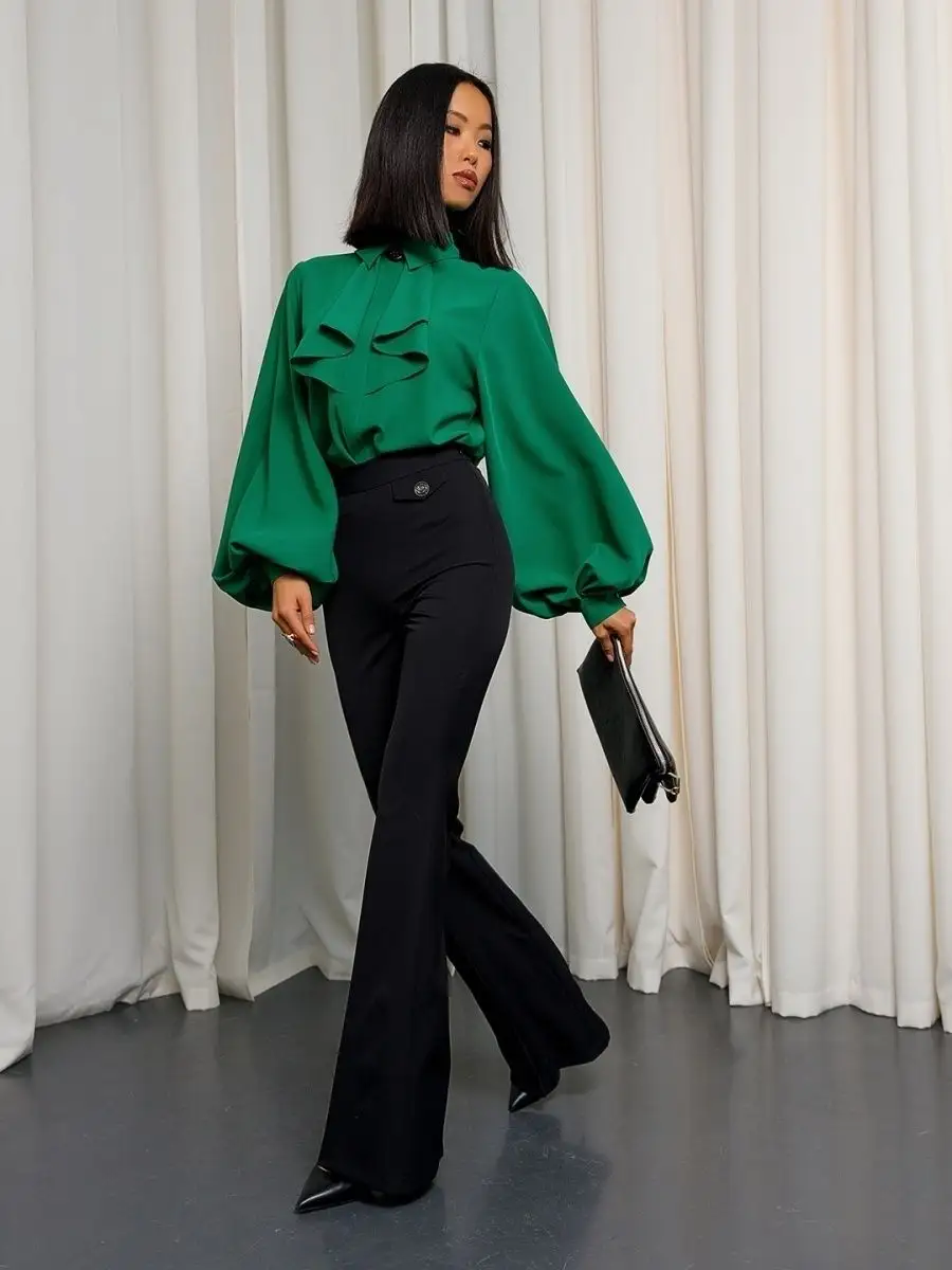 Описание: Стильные брюки-клеш с высокой посадкой и элегантной винтажной фурнитурой. Носите классические женские брюки с жакетами, блузками, свитером или водолазкой. Модные деловые брюки с высокой посадкой визуально вытягивает силуэт, делая ноги зрительно стройнее и длиннее, при этом надежно скрывая любые несовершенства. В конце рабочего дня офисные брюки могут стать частью вечернего образа. (корпоратив, День Рождения, 14 февраля, 8 марта) Стильные брюки застегиваются на потайную молнию сбоку. Брюки клёш с завышенной талией / классические / с высокой посадкой / клеш от колена