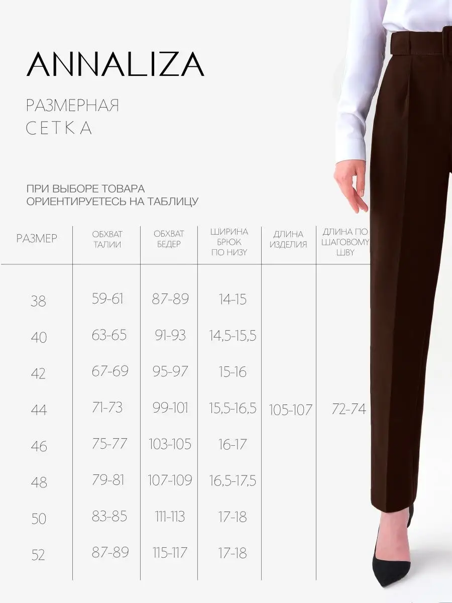 Описание: ТАБЛИЦА РАЗМЕРОВ УКАЗАНА В ГАЛЕРЕЕ ФОТОГРАФИЙ К КАРТОЧКЕ ТОВАРА. Брюки женские классические с высокой посадкой или брюки бананы от Анна Лиза - абсолютный тренд сезона Весна-Лето 2023, любимая классика, придающая женственность образу. РЕКОМЕНДУЕМ ЗАКАЗЫВАТЬ НА РАЗМЕР БОЛЬШЕ, ЧТОБЫ БРЮКИ СМОТРЕЛИСЬ КАК НА МОДЕЛИ НА ФОТО. Классические брюки имеют идеальную посадку, шикарно сидят на бедрах и талии, визуально вытягивают силуэт, делая ноги зрительно стройнее и длиннее, при этом надежно скрывая любые несовершенства. В комплекте с брюками идет декоративный пояс, выполненные из материала брюк. Женские классические брюки составят комплект с топами и жакетами, блузкой, объемным свитером. Подойдут как повседневные, офисные, вечерние. В базовых оттенках - идеальная школьная формы для девушек и девочек. Эти брюки подойдут для любого случая - от офиса до школы, от деловых встреч до праздничных нарядов. Они доступны в различных размерах, для низких и высоких людей, а также для подростков, девочек. Брюки подойдут как: брюки женские летние, брюки женские классические, брюки женские черные, брюки офисные зауженные, брюки офисные укороченные, брюки женские черные, брюки летние классические, штаны женские, штаны женские, летние брюки, есть большие размеры. Не брюки карго. Одежда нашего бренда станет идеальным подарком любимой девушке девочке жене женщине маме подруге на любой праздник: новый год день рождения 8 марта 14 февраля. У нас проходят акции и распродажи, вы можете купить наши товары в подарок со скидкой!