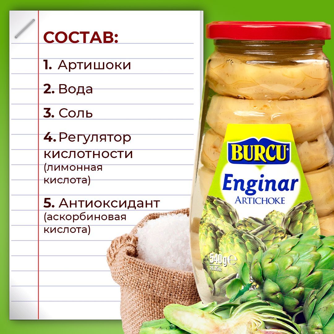 Артишоки, вода, соль, регулятор кислотности (лимонная кислота Е-330), антиоксидант (аскорбиновая кислота Е-300)