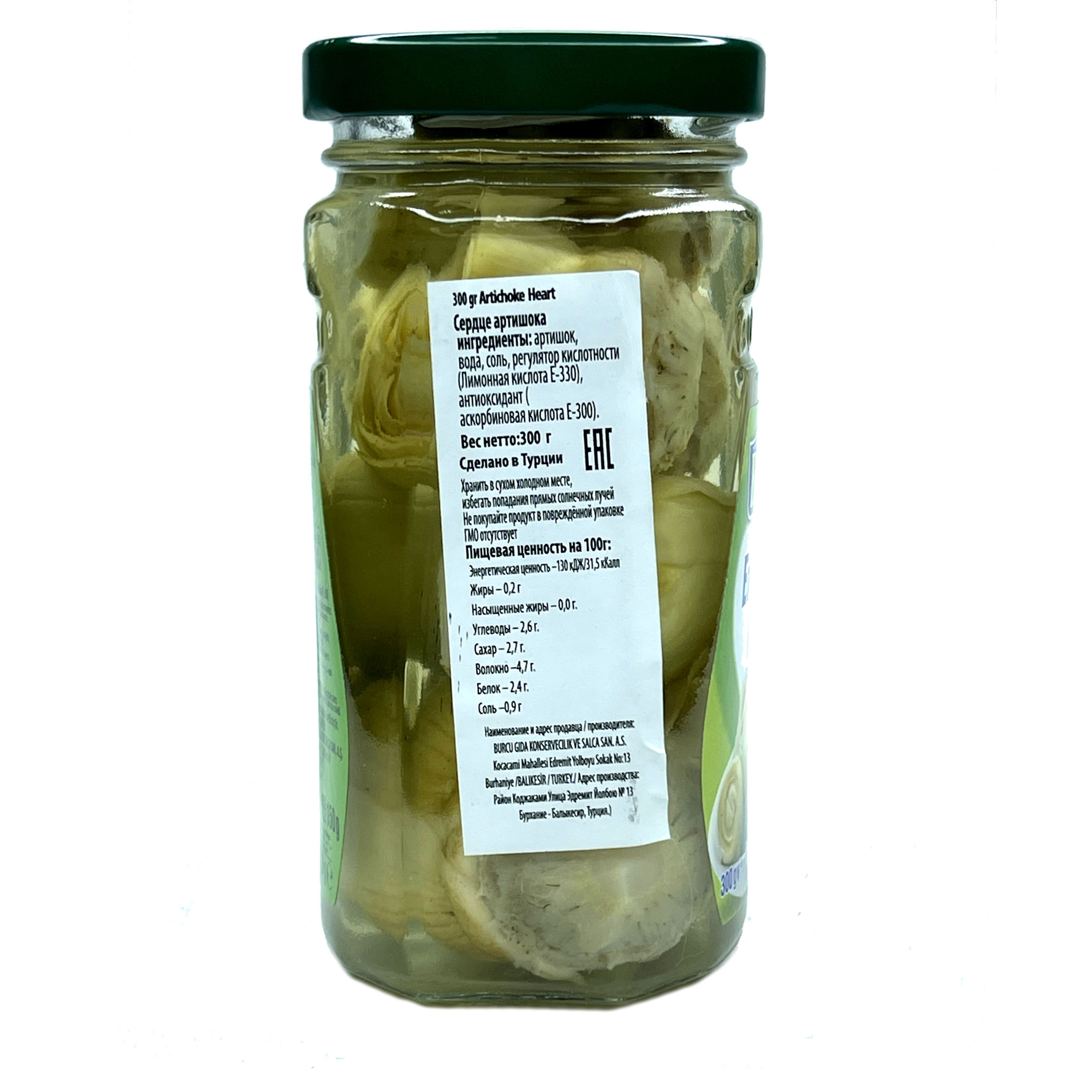 Артишок, вода, соль, регулятор кислотности (Лимонная кислота Е-330), антиоксидант (аскорбиновая кислота Е-300)