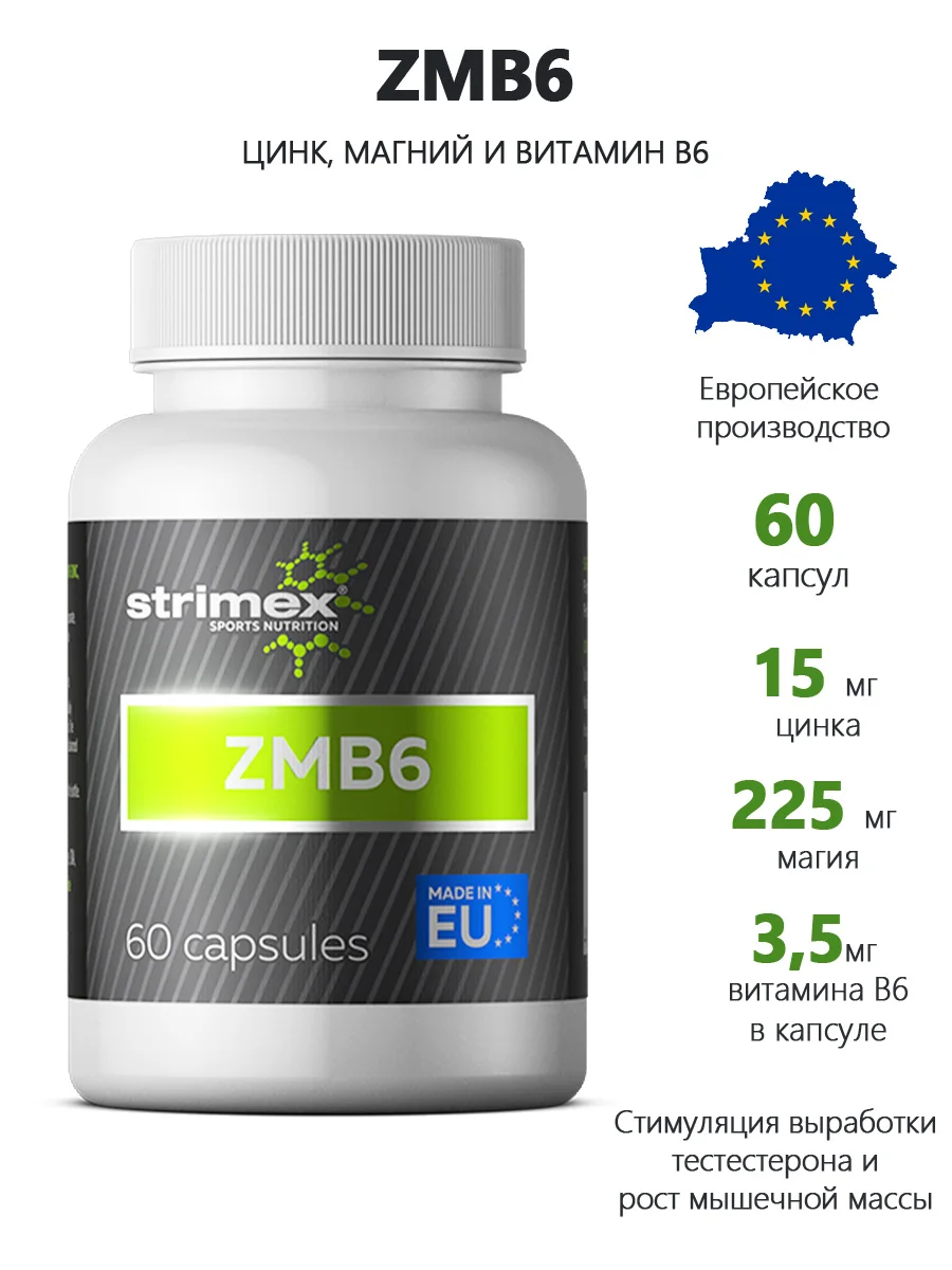 Бустер тестостерона, повышение либидо и гормона роста Strimex ZMB6,60капс. Мужские витамины и БАДы,Цинк Магний B6 для иммунитета