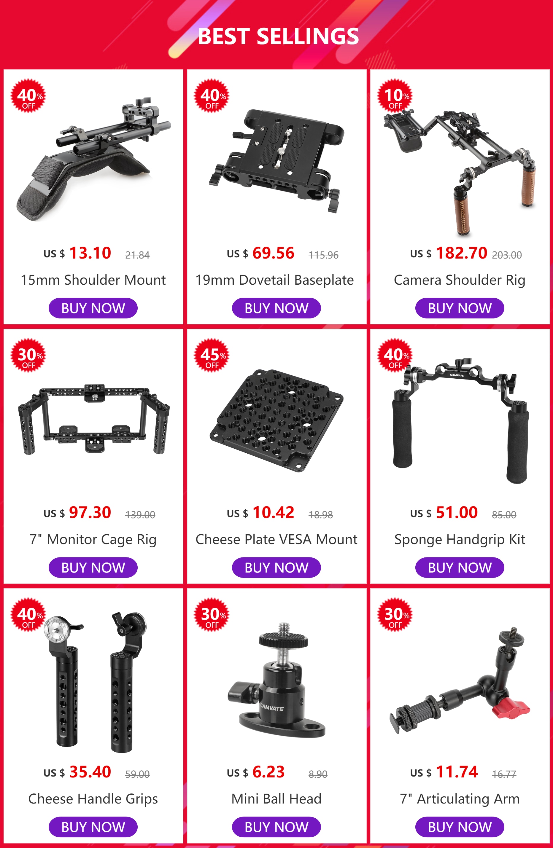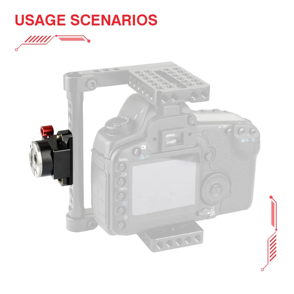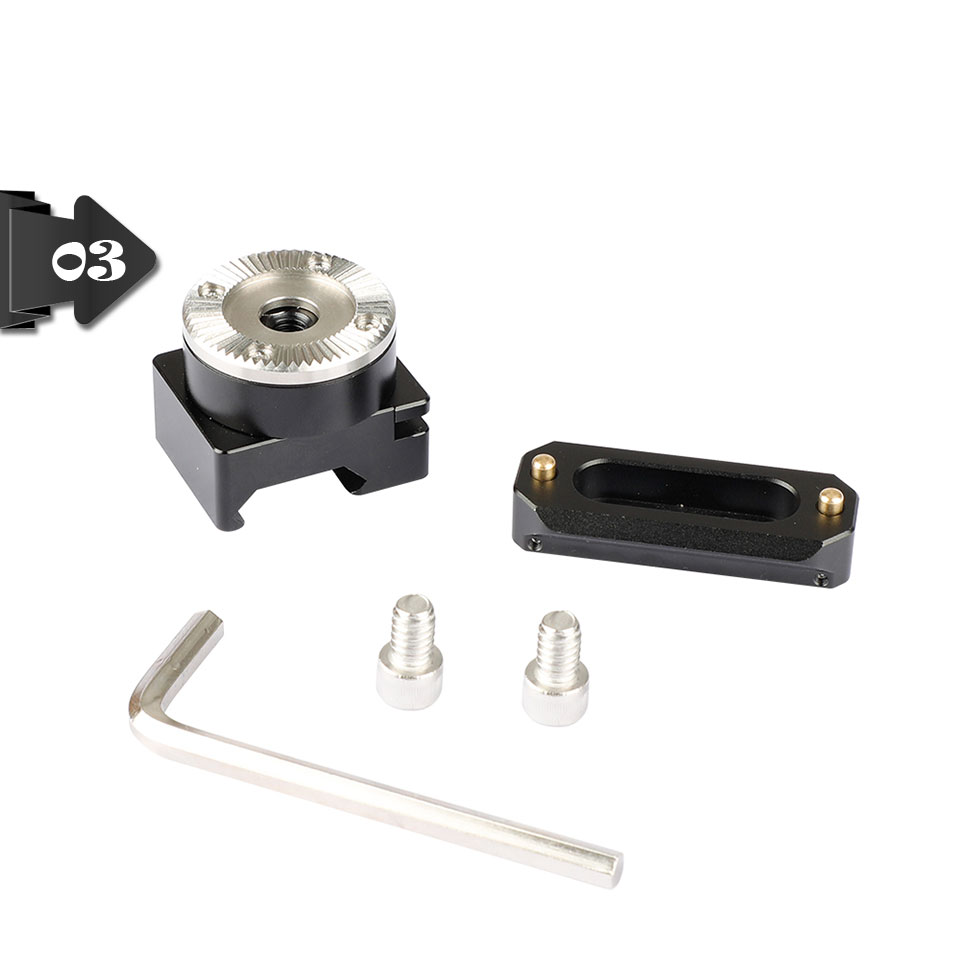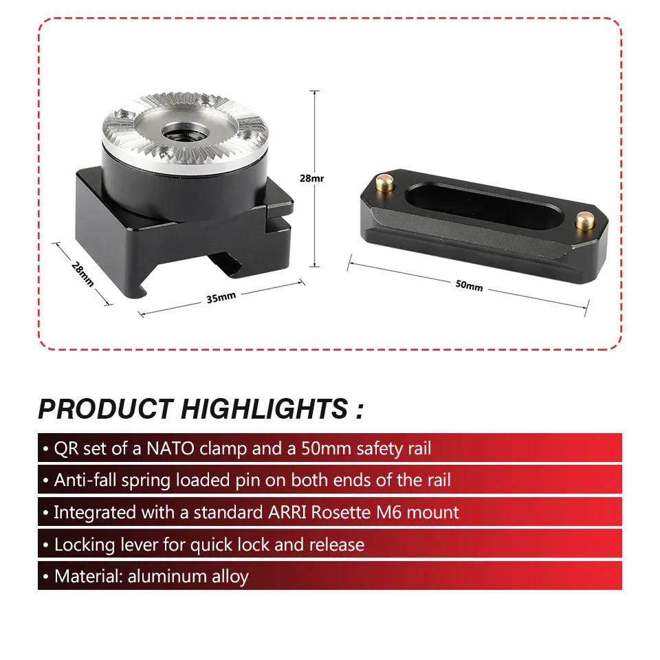 • This quick release set consists of an NATO clamp integrated with a standard ARRI Rosette M6 mount and a 50mm NATO-compatible sliding rail, it can be attached onto any devices with two 1/4"-20 mounting points such as a cage or a handle etc.