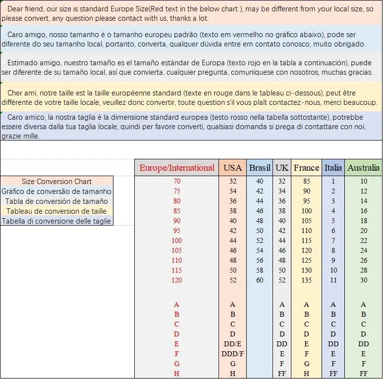 Если вы все еще не уверены в размере, который вам нужен, пожалуйста, сообщите мне свой размер под грудью и верхнюю часть груди в см. Мы рекомендуем вам подходящий размер для вашей справки. Большое спасибо, уважаемый