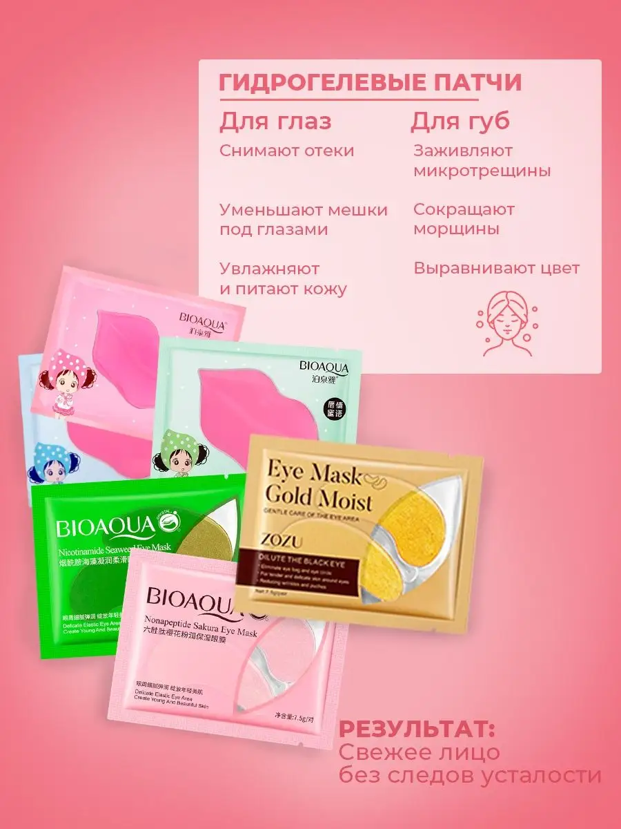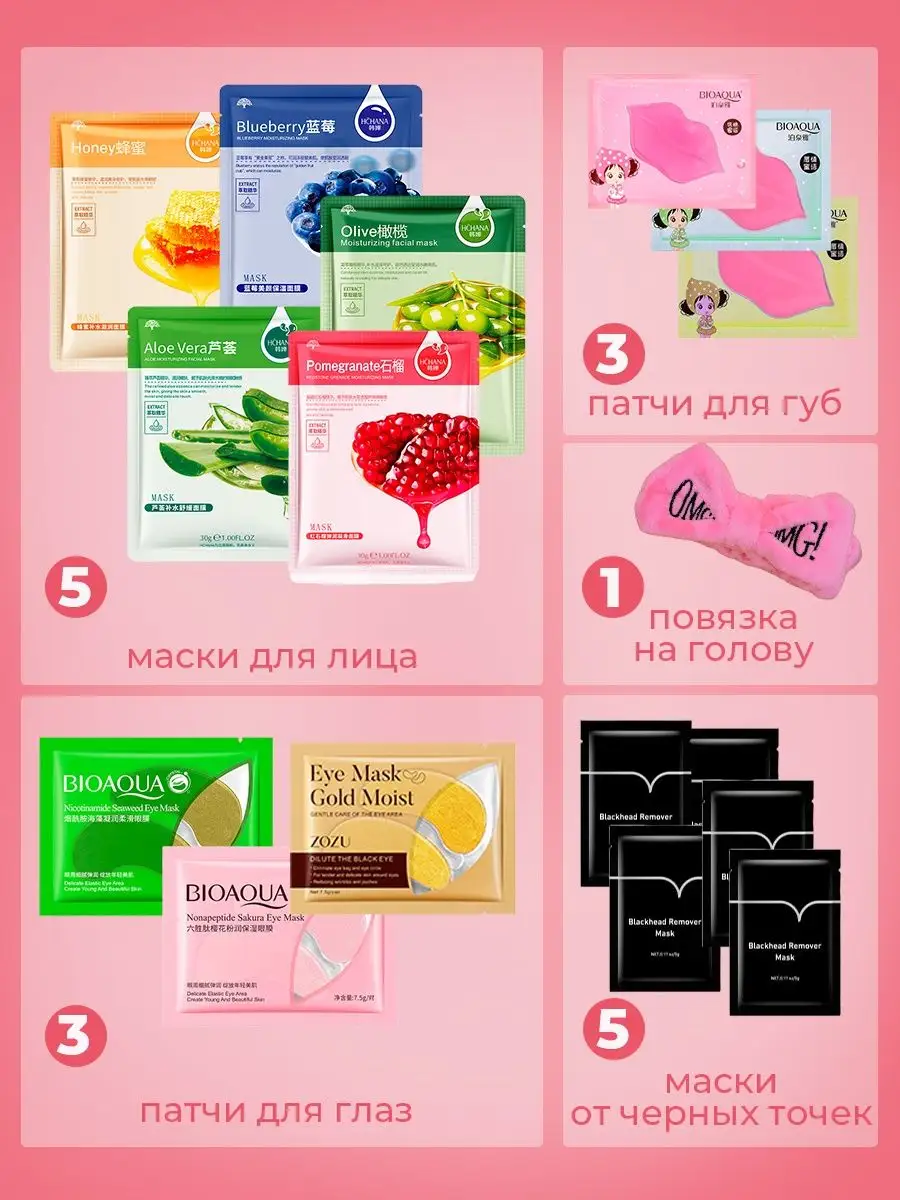 Артикул 151298076 Состав гидрогелевые патчи для глаз; патчи для губ; маска для лица тканевая; маска от черных точек; повязка на голову косметическая