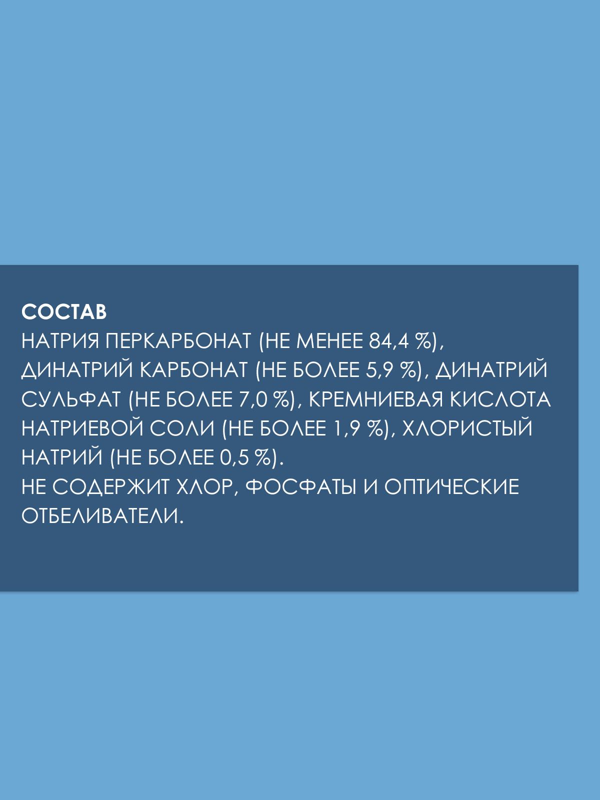 натрия перкарбонат (не менее 84,4 %), динатрий карбонат (не более 5,9 %), динатрий сульфат (не более 7,0 %), кремниевая кислота натриевой соли (не более 1,9 %), хлористый натрий (не более 0,5 %).