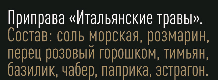 Соль морская, розмарин, тимьян, паприка, базилик, чабер, эстрагон, перец розовый горошком.