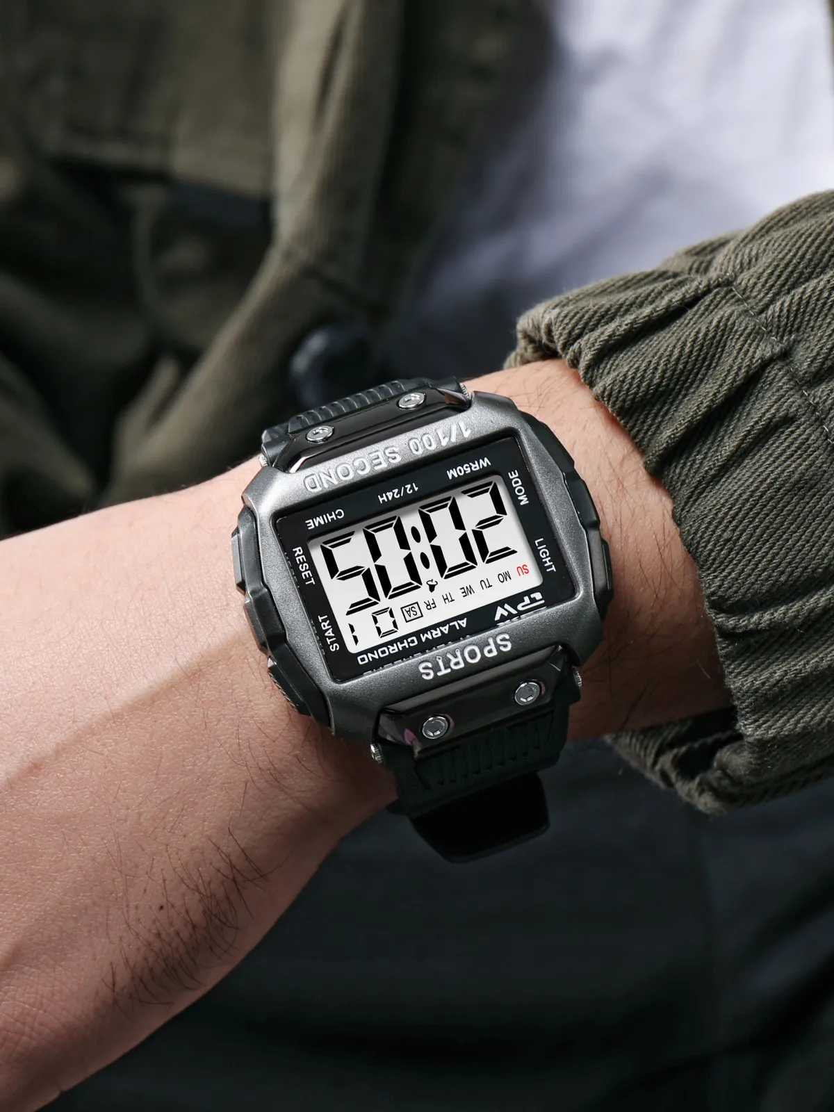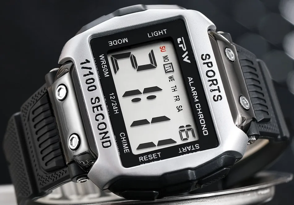 Часы с серебристым/серым/хаки устойчивым к царапинам чехол и фиксированным ободком, цифровым дисплеем и сочетающимся черным/коричневым ремешком из ТПУ. Его функции включают 12/24 ч, функцию дня и даты, будильник, ежечасный будильник, ЖК-экран, подсветку EL, 24-часовой хронограф с разрешением 1/100 секунды и водонепроницаемостью до 50 м.