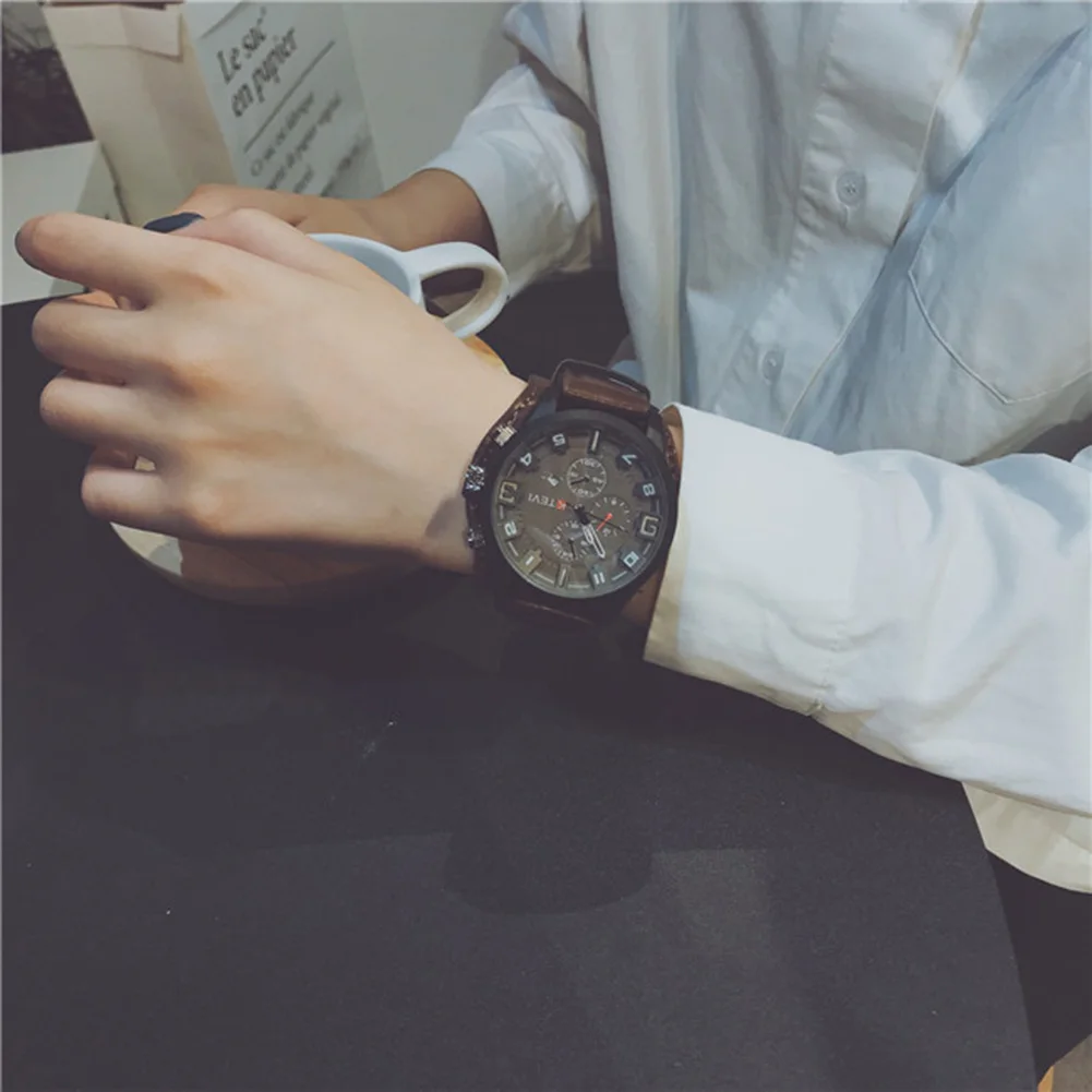 Часы наручные мужские электронные с двойным циферблатом, регулируемый ремешок из искусственной кожи, аналоговый дисплей, кварцевые с большим круглым циферблатом
