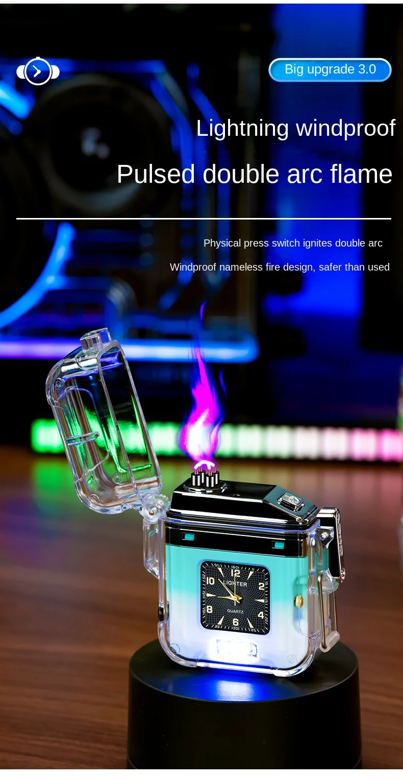 Представляем наши новейшие аксессуары для сигарет-водонепроницаемые часы с плазменной зажигалкой с двойной дугой, прозрачный перезаряжаемый USB-фонарик, беспламенная ветрозащитная Зажигалка! Эта инновационная Зажигалка идеально подходит для любителей активного отдыха и кемпинга благодаря водонепроницаемой конструкции, которая позволяет использовать ее даже под дождем.