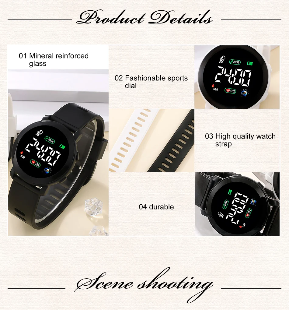 • Светодиодный дисплей :Часы оснащены светодиодным дисплеем, обеспечивающим четкую видимость времени даже в условиях низкой освещенности. Это модный и функциональный аксессуар для пар.