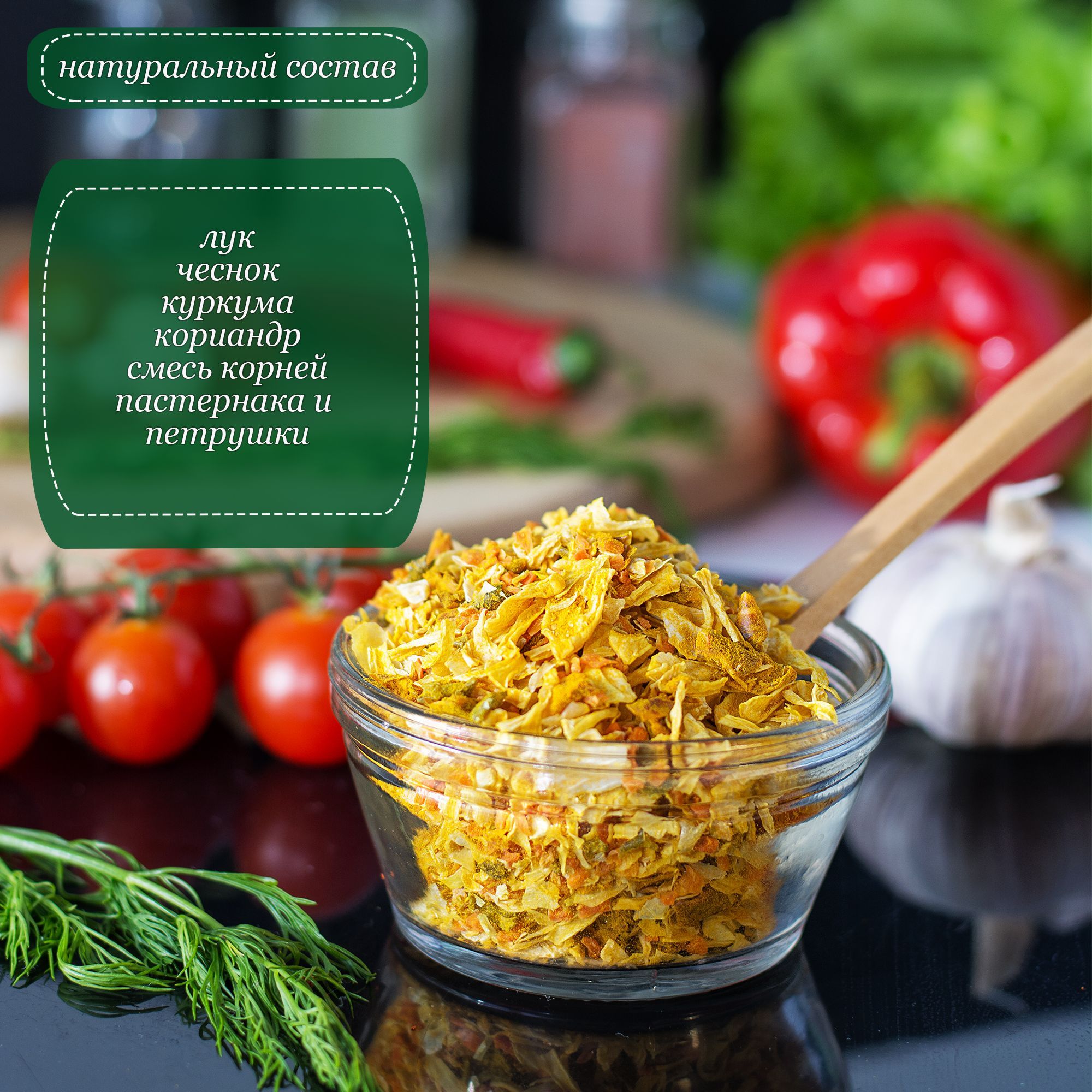 Чеснок , куркума, смесь корней петрушки и пастернака, лук, кориандр.