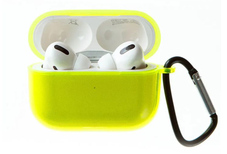 Описание: Защитный прозрачный (жёлтого цвета) силиконовый чехол для AirPods Pro с карабином и со съемной крышкой. Надёжный и стильный аксессуар, который защитит Ваши наушники от порчи и потери.