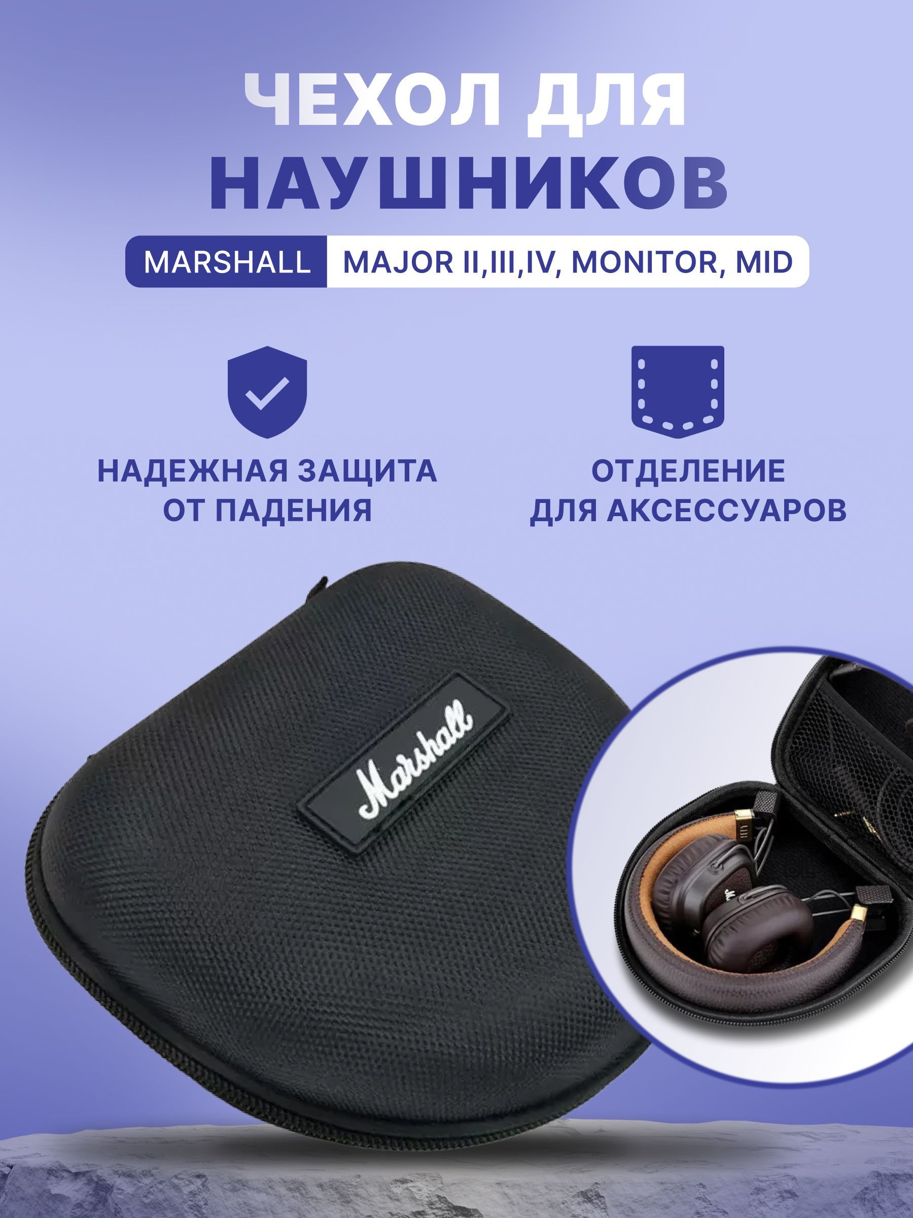 Описание: Противоударная сумка для наушников Marshall Major IV; Major III; Monitor . Чехол отлично совместим с другими наушниками похожих размеров. Отлично подойдет для путешествий и безопасного хранения и переноски наушников!
