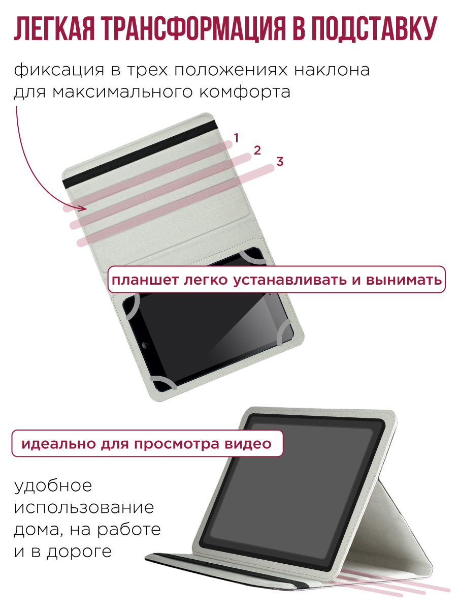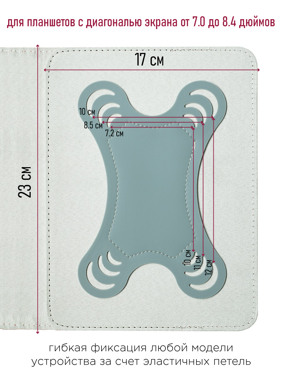 Описание: Универсальный ультратонкий чехол-книжка для планшета Zibelino (крепление бабочка) с резинкой. Предназначен для планшетов с диагональю экрана от 7.0 до 8.4'' дюймов. Чехол изготовлен из высококачественных материалов: внешняя часть экокожа, внутренняя часть, соприкасающаяся с дисплеем - мягкий текстиль. Характеризуется длительным сроком службы. Чехол не подвержен внешнему воздействию, деформации и износу, поэтому в течение продолжительного времени даже при регулярной эксплуатации сохраняет потребительские качества и первоначальные свойства. В качестве крепления используются универсальные фиксаторы из эластичного и прочного силикона. При закрытии чехол фиксируется с помощью резинки. Легко устанавливать и вынимать планшет. Чехол легко трансформируется в удобную подставку. Планшет можно фиксировать в трех разных положениях в режиме просмотра. Свободный доступ ко всем кнопкам, разъемам и динамикам. Универсальный чехол на планшет станет отличным подарком женщинам: маме, жене, любимой, бабушке, подружке, а также мужчинам: папе, мужу, брату, другу, любимому, на любой праздник Новый год, День рождения, 8 марта, День Защитника Отечества.