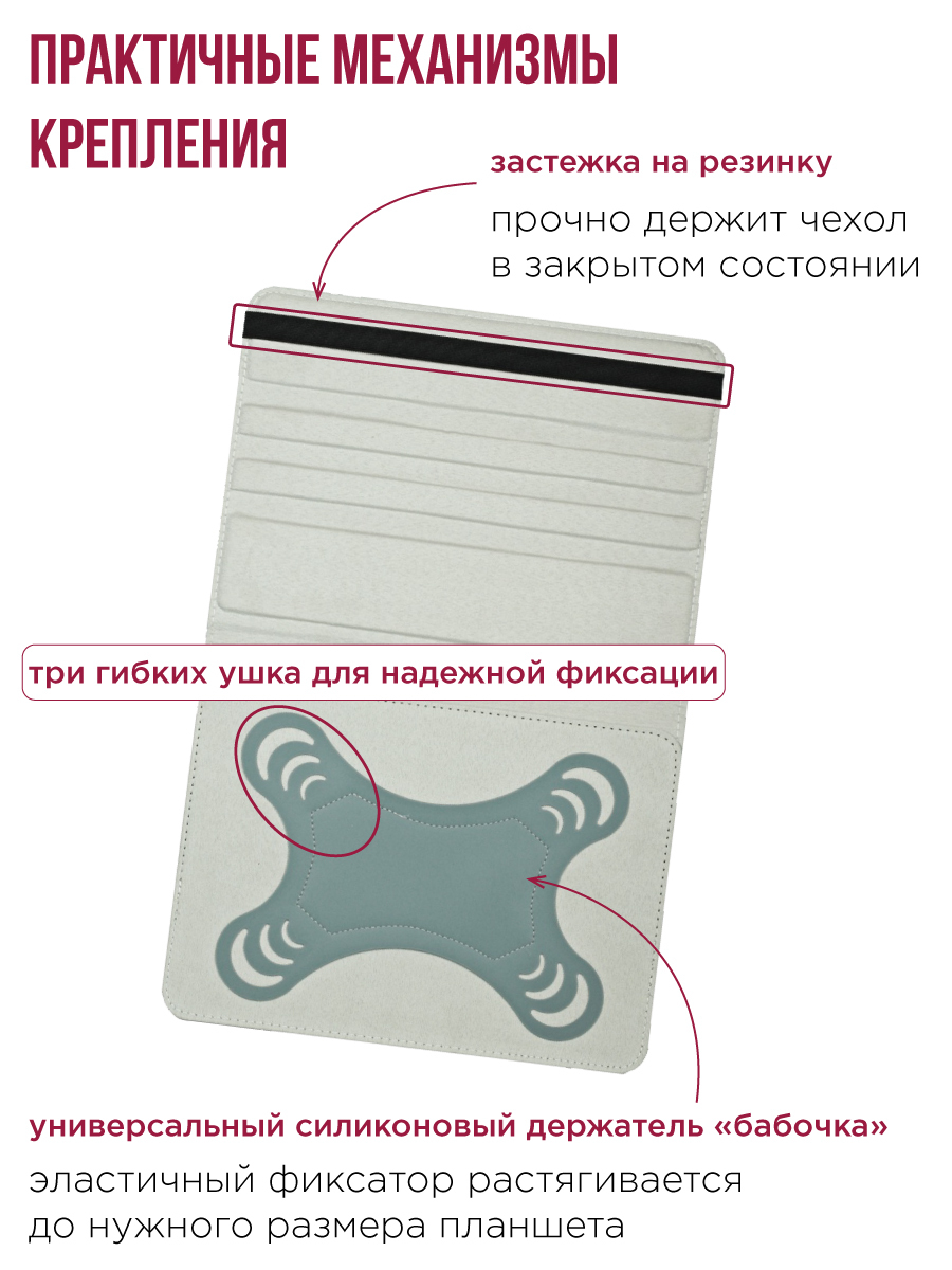 Описание: Универсальный ультратонкий чехол-книжка для планшета Zibelino (крепление бабочка) с резинкой. Предназначен для планшетов с диагональю экрана от 9,7 до 11 дюймов. Чехол изготовлен из высококачественных материалов: внешняя часть экокожа, внутренняя часть, соприкасающаяся с дисплеем - мягкий текстиль. Характеризуется длительным сроком службы. Чехол не подвержен внешнему воздействию, деформации и износу, поэтому в течение продолжительного времени даже при регулярной эксплуатации сохраняет потребительские качества и первоначальные свойства. В качестве крепления используются универсальные фиксаторы из эластичного и прочного силикона. При закрытии чехол фиксируется с помощью резинки. Легко устанавливать и вынимать планшет. Чехол легко трансформируется в удобную подставку. Планшет можно фиксировать в трех разных положениях в режиме просмотра. Свободный доступ ко всем кнопкам, разъемам и динамикам. Универсальный чехол на планшет станет отличным подарком женщинам: маме, жене, любимой, бабушке, подружке, а также мужчинам: папе, мужу, брату, другу, любимому, на любой праздник Новый год, День рождения, 8 марта, День Защитника Отечества.