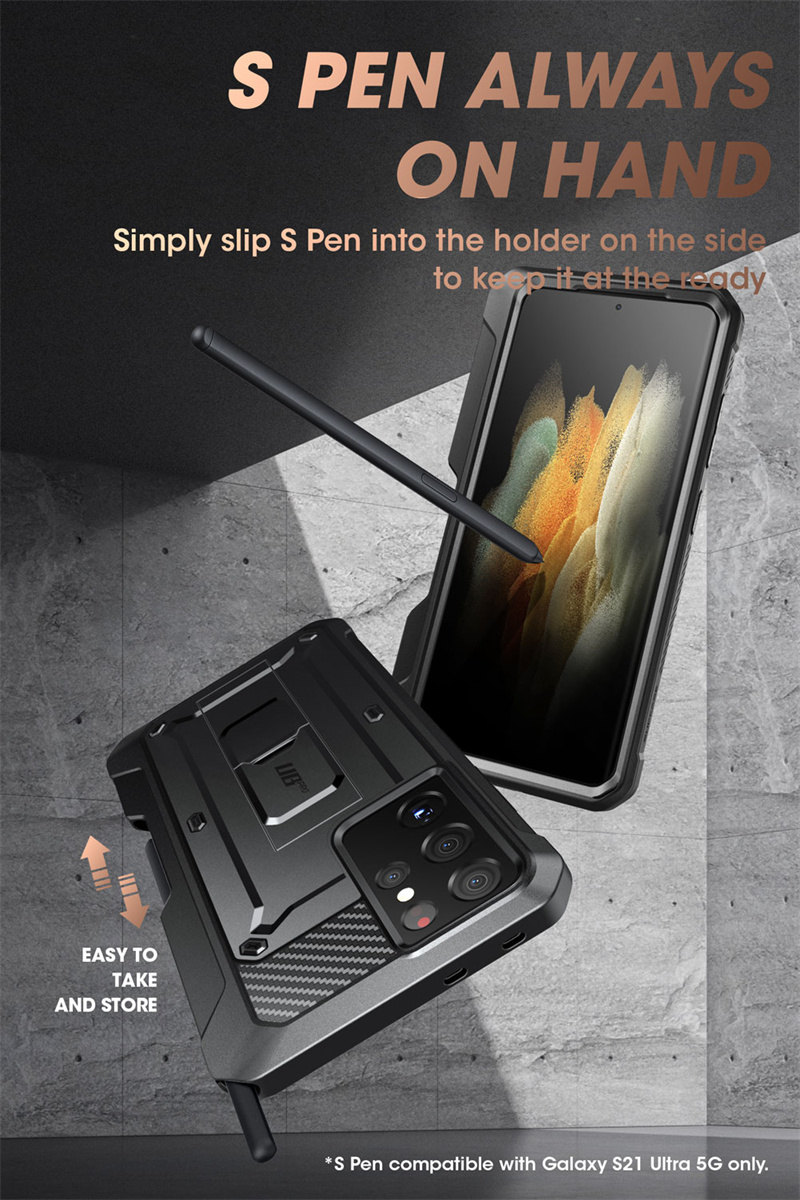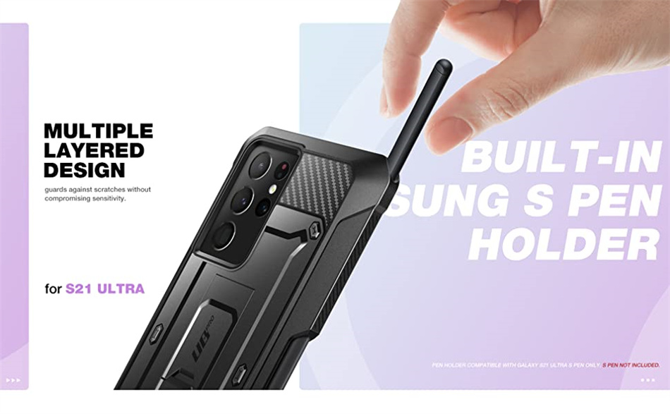 [Встроенный держатель для ручек]: уникальный дизайн, сделанный для хранения ручек, защищает ваш стилус от повседневных приключений. Обратите внимание: держатель для ручек совместим только с Galaxy S21 Ultra S Pen. (S ручка в комплект не входит).