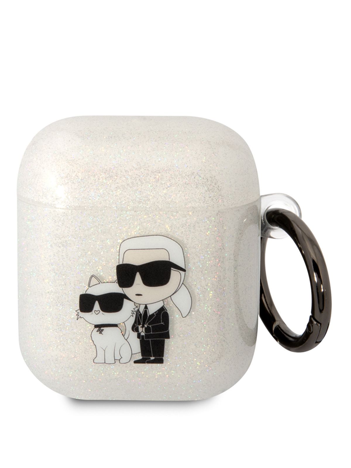 Чехол Karl Lagerfeld TPU Glitters для наушников Apple Airpods 1, 2 / Аирподс силиконовый, с карабином, с блестками и принтом NFT Karl & Choupette, прозрачный