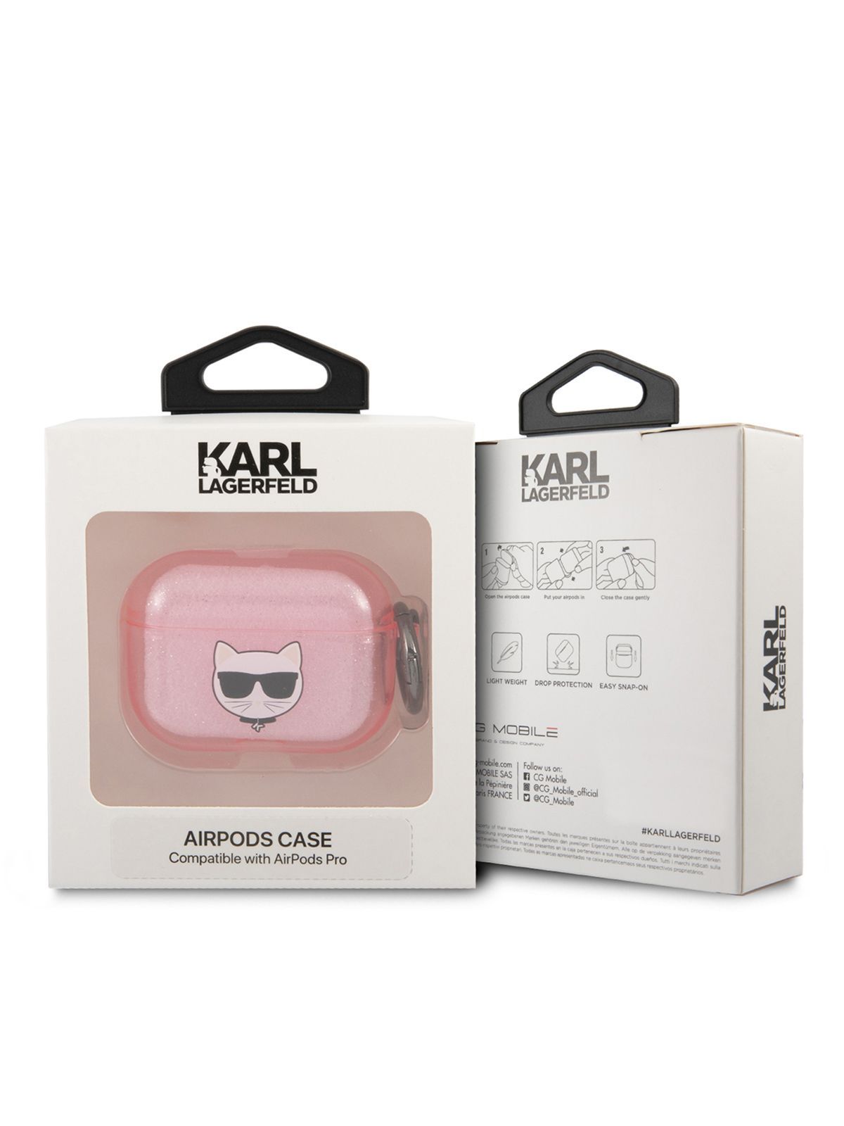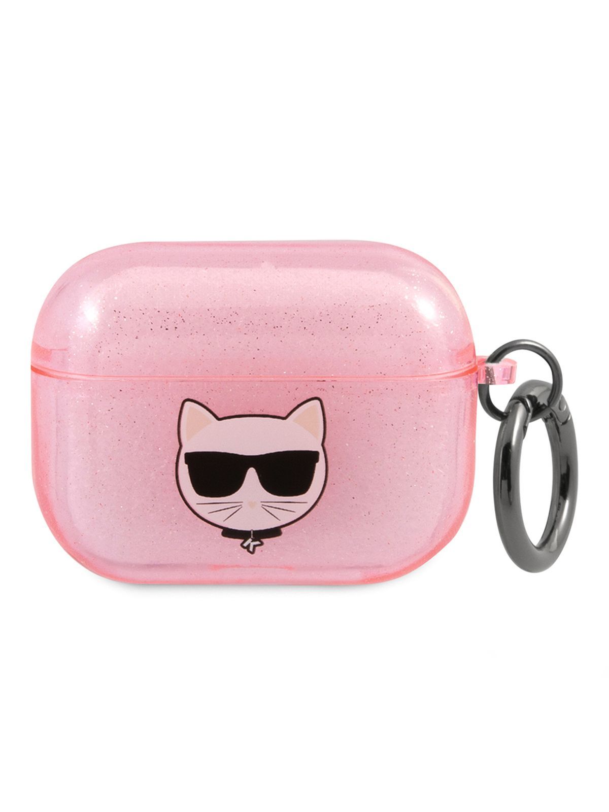 Чехол Karl Lagerfeld TPU Glitters для наушников Apple Airpods Pro / Аирподс Про силиконовый с блестками, с карабином Choupette, прозрачно-розовый