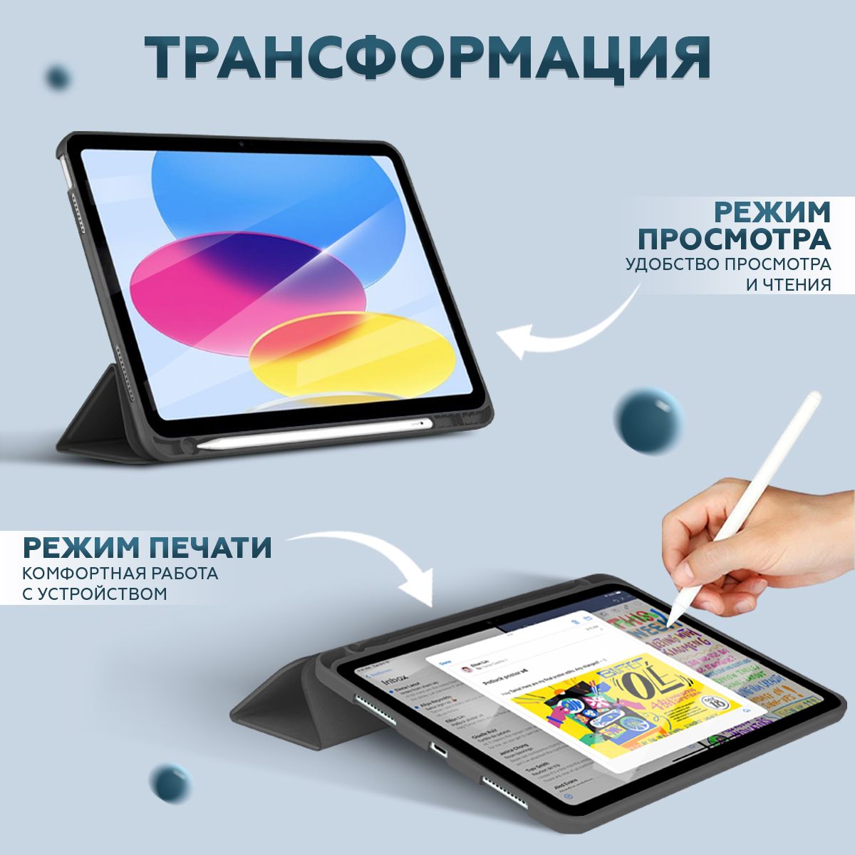 Функция умный чехол для Айпад 10 10.9 (2022) - выполняет блокировку или разблокировку устройства путем закрытия и открытия обложки (крышки) соответственно, а также, функция автоматического перехода в режим sleep / wake-up экономит энергию устройства.